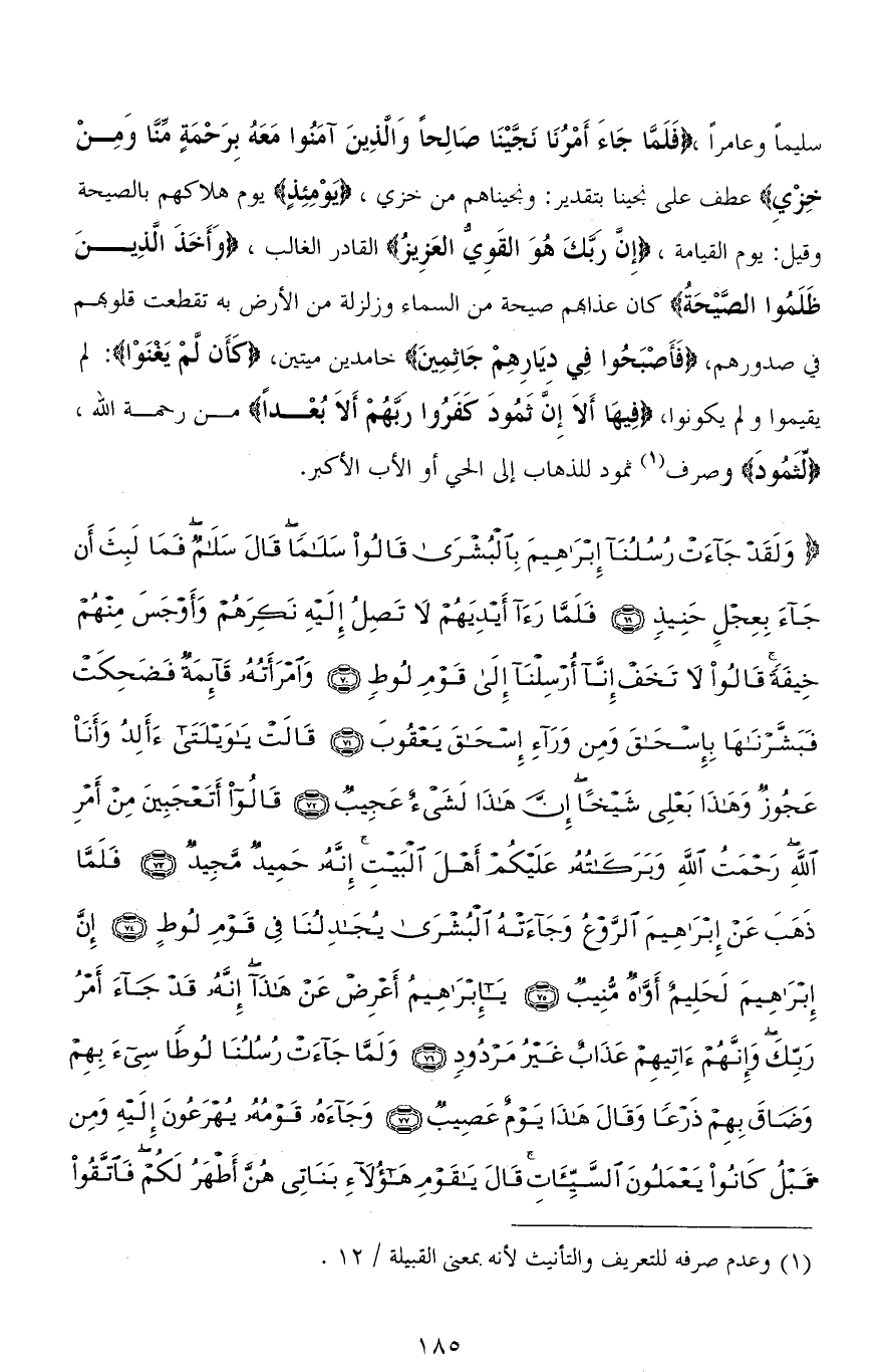 سليمًا وعامرًا، (فَلَمَّا جَاءَ أَمْرُنَا نَجَّيْنَا صَالِحًا وَالَّذِينَ آمَنُوا مَعَهُ بِرَحْمَةٍ منَّا وَمِنْ خِزْيِ) عطف على نجينا بتقدير: ونجيناهم من خزي، (يَوْمِئِذٍ) يوم هلاكهم بالصيحة وقيل: يوم القيامة، (إِنَّ رَبَّكَ هُوَ الْقَوِيُّ الْعَزِيزُ) القادر الغالب، (وَأَخَذَ الَّذِينَ ظَلَمُوا الصَّيْحَةُ) كان عذابهم صيحة من السماء وزلزلة من الأرض به تقطعت قلوبهم في صدورهم، (فَأَصْبَحُوا فِي ديَارِهِمْ جَاثِمِينَ) خامدين ميتين، (كَأَن لَّمْ يَغنَوْا): لم يقيموا ولم يكونوا، (فِيهَا أَلَا إِنَّ ثَمُودَ كَفَرُوا رَبَّهُمْ أَلَا بُعْدًا) من رحمة الله، (لِثَمُودَ) وصرف ثمود للذهاب إلى الحي أو الأب الأكبر.