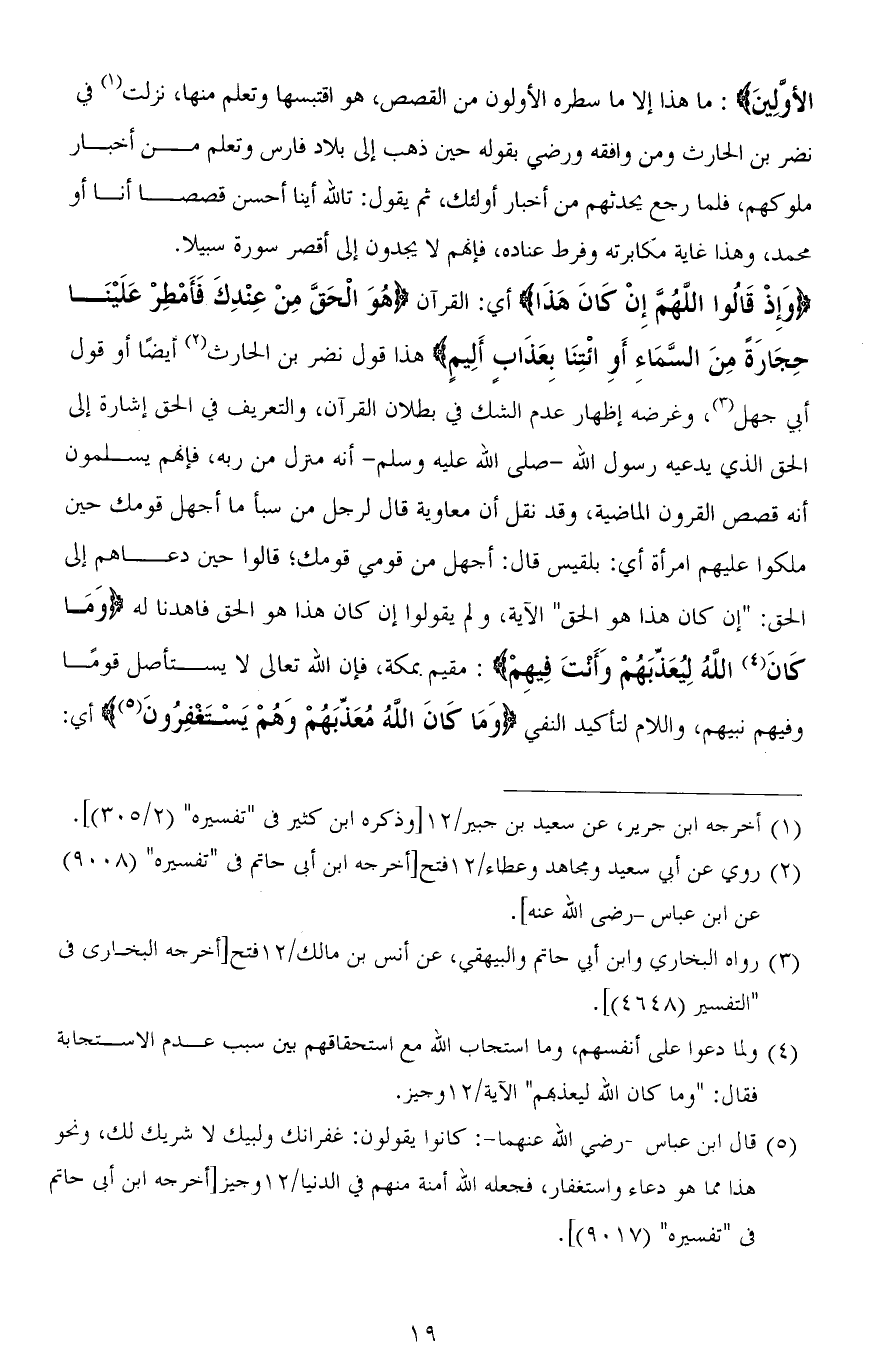 الْأَوَّلِينَ): ما هذا إلا ما سطره الأولون من القصص، هو اقتبسها وتعلم منها، نزلت في نضر بن الحارث ومن وافقه ورضى بقوله حين ذهب إلى بلاد فارس وتعلم من أخبار ملوكهم، فلما رجع يحدثهم من أخبار أولئك، ثم يقول: تالله أينا أحسن قصصًا أنا أو محمد، وهذا غاية مكابرته وفرط عناده، فإنهم لا يجدون إلى أقصر سورة سبيلاً.