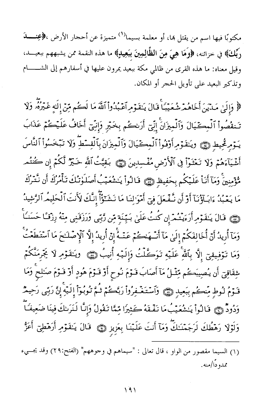 (وَإِلَى مَدْيَنَ أَخَاهُمْ شُعَيْبًا قَالَ يَا قَوْمِ اعْبُدُوا اللهَ مَا لَكُمْ مِنْ إِلَهٍ غَيْرُهُ وَلَا تَنْقُصُوا الْمِكْيَالَ وَالْمِيزَانَ إِنِّي أَرَاكُمْ بِخَيْرٍ وَإِنِّي أَخَافُ عَلَيْكُمْ عَذَابَ يَوْمٍ مُحِيطٍ (84) وَيَا قَوْمِ أَوْفُوا الْمِكْيَالَ وَالْمِيزَانَ بِالْقِسْطِ وَلَا تَبْخَسُوا النَّاسَ أَشْيَاءَهُمْ وَلَا تَعْثَوْا فِي الْأَرْضِ مُفْسِدِينَ (85) بَقِيَّتُ اللهِ خَيْرٌ لَكُمْ إِنْ كُنْتُمْ مُؤْمِنِينَ وَمَا أَنَا عَلَيْكُمْ بِحَفِيظٍ (86) قَالُوا يَا شُعَيْبُ أَصَلَاتُكَ تَأْمُرُكَ أَنْ نَتْرُكَ مَا يَعْبُدُ آبَاؤُنَا أَوْ أَنْ نَفْعَلَ فِي أَمْوَالِنَا مَا نَشَاءُ إِنَّكَ لَأَنْتَ الْحَلِيمُ الرَّشِيدُ (87) قَالَ يَا قَوْمِ أَرَأَيْتُمْ إِنْ كُنْتُ عَلَى بَيِّنَةٍ مِنْ رَبِّي وَرَزَقَنِي مِنْهُ رِزْقًا حَسَنًا وَمَا أُرِيدُ أَنْ أُخَالِفَكُمْ إِلَى مَا أَنْهَاكُمْ عَنْهُ إِنْ أُرِيدُ إِلَّا الْإِصْلَاحَ مَا اسْتَطَعْتُ وَمَا تَوْفِيقِي إِلَّا بِاللهِ عَلَيْهِ تَوَكَّلْتُ وَإِلَيْهِ أُنِيبُ (88) وَيَا قَوْمِ لَا يَجْرِمَنَّكُمْ شِقَاقِي أَنْ يُصِيبَكُمْ مِثْلُ مَا أَصَابَ قَوْمَ نُوحٍ أَوْ قَوْمَ هُودٍ أَوْ قَوْمَ صَالِحٍ وَمَا قَوْمُ لُوطٍ مِنْكُمْ بِبَعِيدٍ (89) وَاسْتَغْفِرُوا رَبَّكُمْ ثُمَّ تُوبُوا إِلَيْهِ إِنَّ رَبِّي رَحِيمٌ وَدُودٌ (90) قَالُوا يَا شُعَيْبُ مَا نَفْقَهُ كَثِيرًا مِمَّا تَقُولُ وَإِنَّا لَنَرَاكَ فِينَا ضَعِيفًا وَلَوْلَا رَهْطُكَ لَرَجَمْنَاكَ وَمَا أَنْتَ عَلَيْنَا بِعَزِيزٍ (91) قَالَ يَا قَوْمِ أَرَهْطِي أَعَزُّ