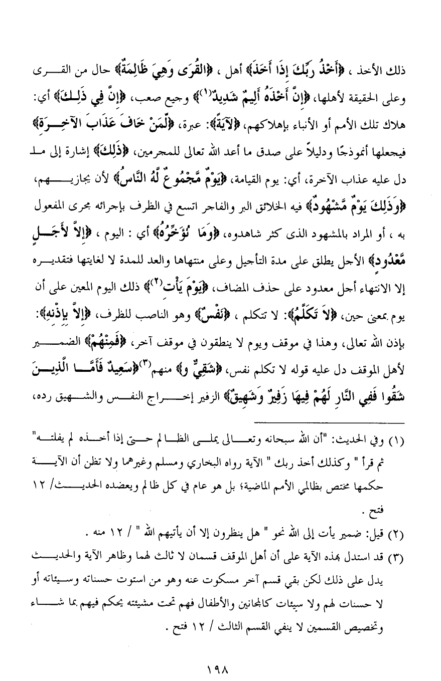 ذلك الأخذ، (أَخْذُ رَبِّكَ إِذَا أَخَذَ) أهل، (الْقُرَى وَهِيَ ظَالِمَةٌ) حال من القرى وعلى الحقيقة لأهلها، (إِنَّ أَخْذَهُ أَلِيمٌ شَدِيدٌ) وجيع صعب، (إِنَّ فِي ذَلِكَ) أي: هلاك تلك الأمم أو الأنباء بإهلاكهم، (لَآيَةً): عبرة، (لِّمَنْ خَافَ عَذَابَ الْآخِرَةِ) فيجعلها أنموذجًا ودليلاً على صدق ما أعد الله تعالى للمجرمين، (ذلِكَ) إشارة إلى ما دل عليه عذاب الآخرة، أي: يوم القيامة، (يَوْمٌ مَجْمُوعٌ لَهُ النَّاسُ) لأن يجازيهم، (وَذَلِكَ يَوْمٌ مَشْهُودٌ) فيه الخلائق البر والفاجر اتسع في الظرف بإجرائه مجرى المفعول به، أو المراد بالمشهود الذي كثر شاهدوه، (وَمَا نُؤَخِّرُهُ) أي: اليوم، (إِلَّا لِأَجَلٍ مَعْدُودٍ) الأجل يطلق على مدة التأجيل وعلى منتهاها والعد للمدة لا لغايتها فتقديره إلا الانتهاء أجل معدود على حذف المضاف، (يَوْمَ يَأْتِ) ذلك اليوم المعين على أن يوم بمعنى حين، (لَا تَكَلَّمُ): لا تتكلم، (نَفْسٌ) وهو الناصب للظرف، (إِلَّا بِإِذْنِهِ): بإذن الله تعالى، وهذا في موقف ويوم لا ينطقون في موقف آخر، (فَمِنْهُمْ) الضمير لأهل الموقف دل عليه قوله لا تكلم نفى، (شَقِيٌّ وَ) منهم (سَعِيدٌ فَأَمَّا الَّذِينَ شَقوا فَفِي النَّارِ لَهُمْ فِيهَا زَفِيرٌ وَشَهِيقٌ) الزفير إخراج النفس والشهيق ردُّه،