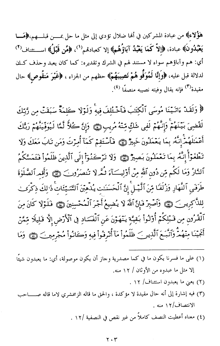 (وَلَقَدْ آتَيْنَا مُوسَى الْكِتَابَ فَاخْتُلِفَ فِيهِ وَلَوْلَا كَلِمَةٌ سَبَقَتْ مِنْ رَبِّكَ لَقُضِيَ بَيْنَهُمْ وَإِنَّهُمْ لَفِي شَكٍّ مِنْهُ مُرِيبٍ (110) وَإِنَّ كُلًّا لَمَّا لَيُوَفِّيَنَّهُمْ رَبُّكَ أَعْمَالَهُمْ إِنَّهُ بِمَا يَعْمَلُونَ خَبِيرٌ (111) فَاسْتَقِمْ كَمَا أُمِرْتَ وَمَنْ تَابَ مَعَكَ وَلَا تَطْغَوْا إِنَّهُ بِمَا تَعْمَلُونَ بَصِيرٌ (112) وَلَا تَرْكَنُوا إِلَى الَّذِينَ ظَلَمُوا فَتَمَسَّكُمُ النَّارُ وَمَا لَكُمْ مِنْ دُونِ اللهِ مِنْ أَوْلِيَاءَ ثُمَّ لَا تُنْصَرُونَ (113) وَأَقِمِ الصَّلَاةَ طَرَفَيِ النَّهَارِ وَزُلَفًا مِنَ اللَّيْلِ إِنَّ الْحَسَنَاتِ يُذْهِبْنَ السَّيِّئَاتِ ذَلِكَ ذِكْرَى لِلذَّاكِرِينَ (114) وَاصْبِرْ فَإِنَّ اللهَ لَا يُضِيعُ أَجْرَ الْمُحْسِنِينَ (115) فَلَوْلَا كَانَ مِنَ الْقُرُونِ مِنْ قَبْلِكُمْ أُولُو بَقِيَّةٍ يَنْهَوْنَ عَنِ الْفَسَادِ فِي الْأَرْضِ إِلَّا قَلِيلًا مِمَّنْ أَنْجَيْنَا مِنْهُمْ وَاتَّبَعَ الَّذِينَ ظَلَمُوا مَا أُتْرِفُوا فِيهِ وَكَانُوا مُجْرِمِينَ (116)