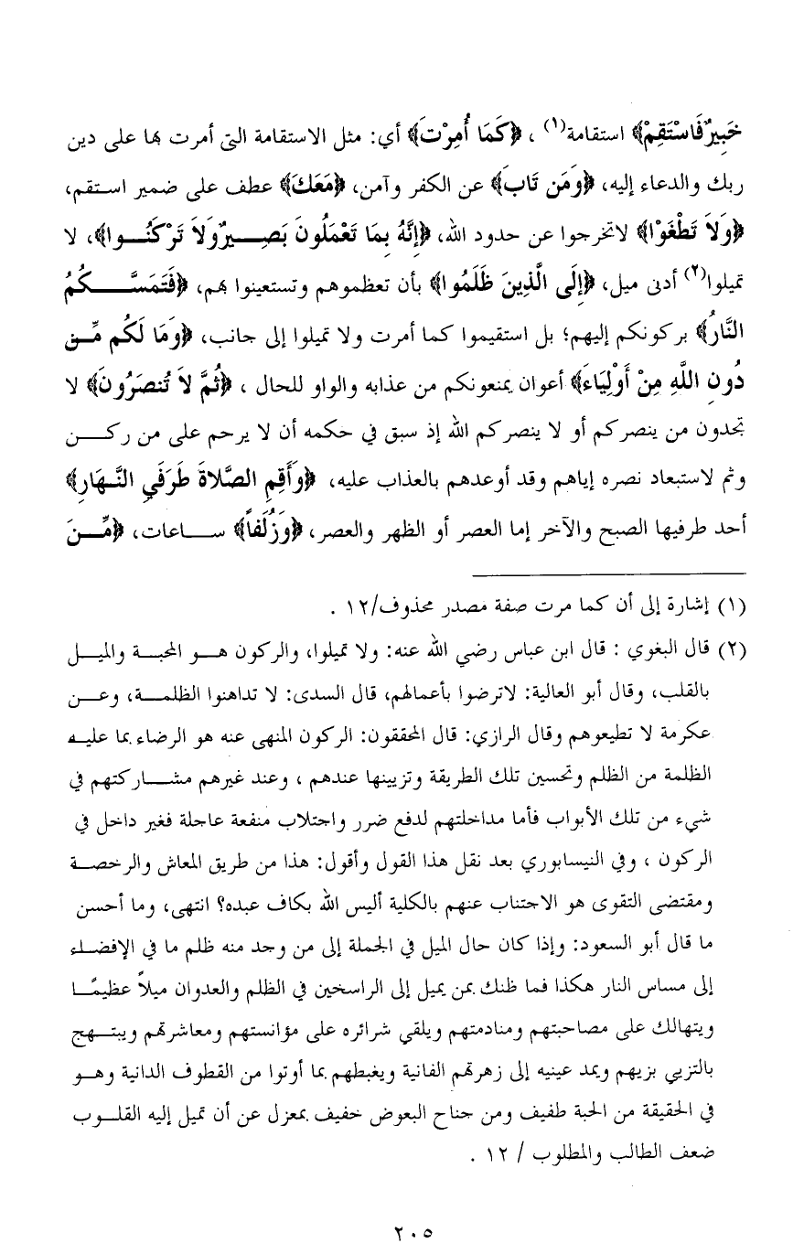 خَبِيرٌ (111) فَاسْتَقِمْ) استقامة، (كَمَا أُمِرْتَ) أي: مثل الاستقامة التي أمرت بها على دين ربك والدعاء إليه، (وَمَن تَابَ) عن الكفر وآمن، (مَعَكَ) عطف على ضمير استقم، (وَلاَ تَطْغَوْا) لا تخرجوا عن حدود الله، (إِنَّهُ بِمَا تَعْمَلُونَ بَصِيرٌ (112) وَلَا تَرْكَنُوا)، لا تميلوا أدنى ميل، (إِلَى الَّذِينَ ظَلَمُوا) بأن تعظموهم وتسعينوا بهم، (فَتَمَسَّكُمُ النَّارُ) بركونكم إليهم؛ بل استقيموا كما أمرت ولا تميلوا إلى جانب، (وَمَا لَكُمْ مِنْ دُونِ اللهِ مِنْ أَوْلِيَاءَ) أعوان يمنعونكم من عذابه والواو للحال، (ثُمَّ لَا تُنْصَرُونَ) لا تجدون من ينصركم أو لا ينصركم الله إذ سبق في حكمه أن لا يرحم على من ركن وثم لاستبعاد نصره إياهم وقد أوعدهم بالعذاب عليه، (وَأَقِمِ الصَّلَاةَ طَرَفَيِ النَّهَارِ) أحد طرفيها الصبح والآخر إما العصر أو الظهر والعصر، (وَزُلَفًا) ساعات، (مِنَ
