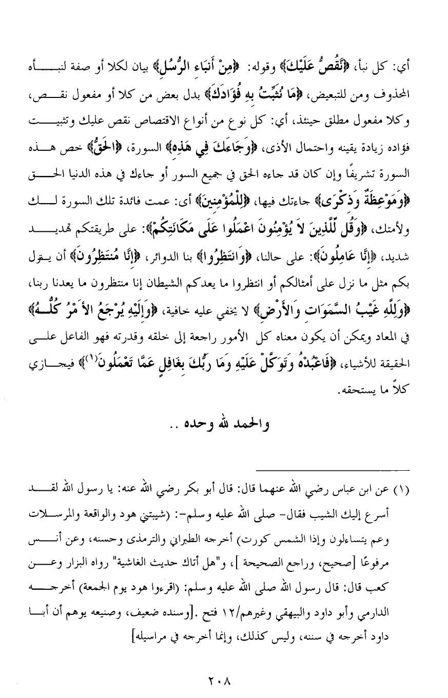 أي: كل نبأ، (نَقُصُّ عَلَيكَ) وقوله: (مِنْ أَنْبَاءِ الرُّسُلِ) بيان لـ (كُلًّا) أو صفة لنبأه المحذوف ومن للتبعيض، (مَا نُثَبِّتُ بِهِ فُؤَادَكَ) بدل بعضو من كلا أو مفعول نقص، وكلا مفعول مطلق حينئذ، أي: كل نوع من أنواع الاقتصاص نقص عليك وتثبيت فؤاده زيادة يقينه واحتمال الأذى، (وَجَاءَكَ فِي هَذِهِ) السورة، (الْحَقُّ) خص هذه السورة تشريفًا وإن كان قد جاءه الحق في جميع السور أو جاءك في هذه الدنيا الحق (وَمَوْعِظَةٌ وَذِكْرَى) جاءتك فيها، (لِلْمُؤْمِنِينَ) أي: عمت فائدة تلك السورة لك ولأمتك، (وَقُلْ لِلَّذِينَ لَا يُؤْمِنُونَ اعْمَلُوا عَلَى مَكَانَتِكُمْ): على طريقتكم تهديد شديد، (إِنَّا عَامِلُونَ): على حالنا، (وَانتَظِرُوا) لنا الدوائر، (إِنَّا مُنتَظِرُونَ) أن ينزل بكم مثل ما نزل على أمثالكم أو انتظروا ما يعدكم الشيطان إنا منتظرون ما يعدنا ربنا، (وَلله غَيْبُ السَّمَاوَاتِ وَالأَرْضِ) لا يخفي عليه خافية، (وَإِلَيهِ يُرْجَعُ الأَمْرُ كُلُّهُ) في المعاد ويمكن أن يكون معناه كل الأمور راجعة إلى خلقه وقدرته فهو الفاعل على الحقيقة للأشياء، (فَاعْبُدْهُ وَتَوَكَّلْ عَلَيْهِ وَمَا رَبُّكَ بِغَافِلٍ عَمَّا تَعْمَلُونَ) فيجازي كلًّا مايستحقه.
