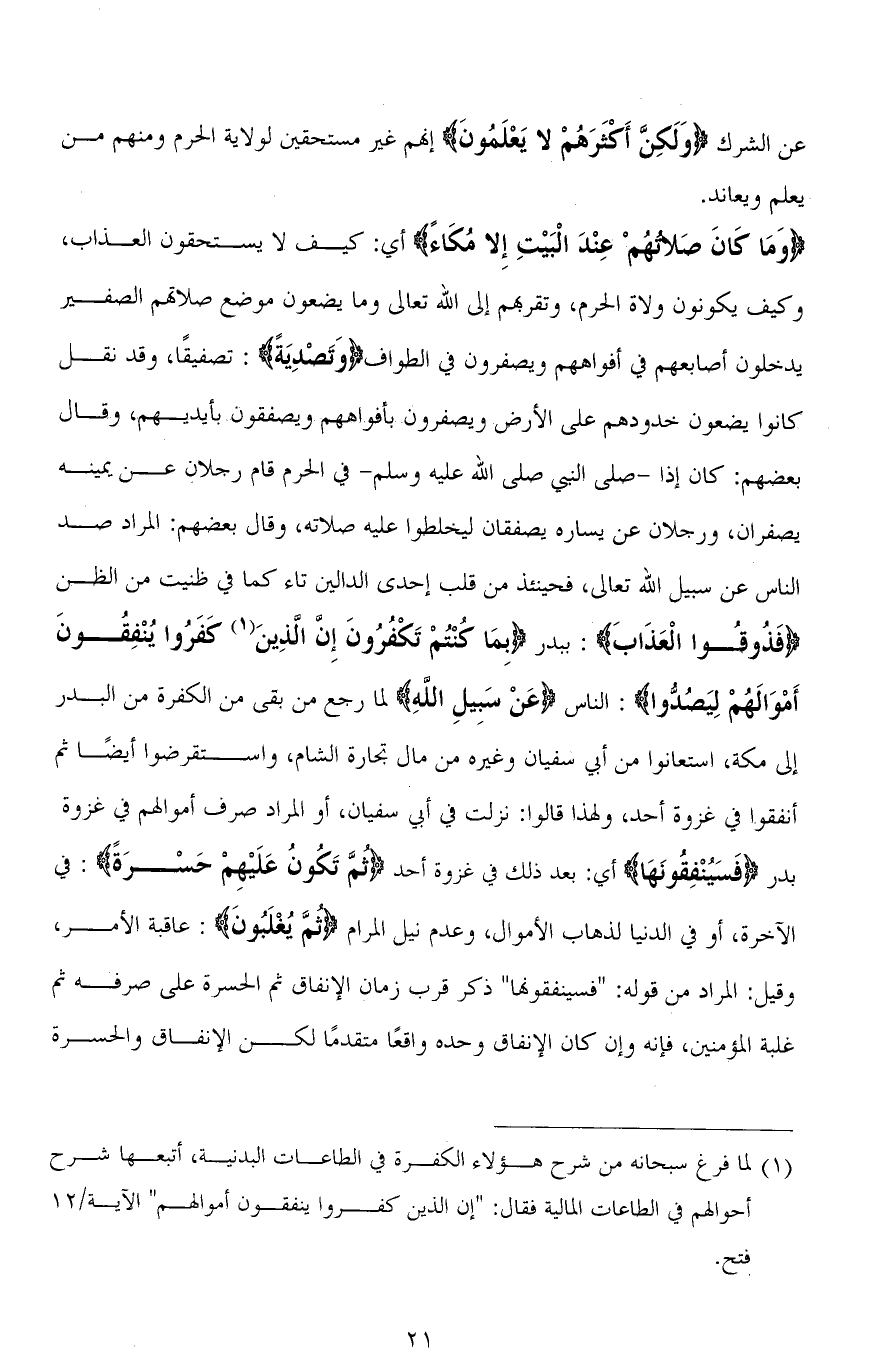 (وَمَا كَانَ صَلاتهُمْ عِنْدَ الْبَيْتِ إِلا مُكَاءً) أي: كيف لا يستحقون العذاب، وكيف يكونون ولاة الحرم، وتقربهم إلى الله تعالى وما يضعون موضع صلاتهم الصفير يدخلون أصابعهم في أفواههم ويصفرون في الطواف (وَتَصْدِيَةً): تصفيقًا، وقد نقل كانوا يضعون خدودهم على الأرض ويصفرون بأفواههم ويصفقون بأيديهم، وقال بعضهم: كان إذا - صلى النبي صلى الله عليه وسلم - في الحرم قام رجلان عن يمينه يصفران، ورجلان عن يساره يصفقان ليخلطوا عليه صلاته، وقال بعضهم: المراد صد الناس عن سبيل الله تعالى، فحينئذ من قلب إحدى الدالين تاء كما في ظنيت من الظن (فَذُوقُوا الْعَذَابَ): ببدر (بِمَا كُنْتُمْ تَكْفُرُونَ إِنَّ الَّذِينَ كَفَرُوا يُنْفِقُونَ أَمْوَالَهُمْ لِيَصُدُّوا): الناس (عَنْ سبِيلِ اللهِ) لما رجع من بقى من الكفرة من بدر إلى مكة، استعانوا من أبي سفيان وغيره من مال تجارة الشام، واستقرضوا أيضًا ثم أنفقوا في غزوة أحد، ولهذا قالوا: نزلت في أبي سفيان، أو المراد صرف أموالهم في غزوة بدر (فَسَيُنْفِقُونَهَا) أي: بعد ذلك في غزوة أحد (ثُمَّ تَكُونُ عَلَيْهِمْ حَسْرَةً): في الآخرة، أو في الدنيا لذهاب الأموال، وعدم نيل المرام (ثُمَّ يُغْلَبُونَ): عاقبة الأمر، وقيل: المراد من قوله: " فَسَيُنْفِقُونَهَا " ذكر قرب زمان الإنفاق ثم الحسرة على صرفه ثم غلبة المؤمنين، فإنه وإن كان الإنفاق وحده واقعًا متقدمًا لكن الإنفاق والحسرة