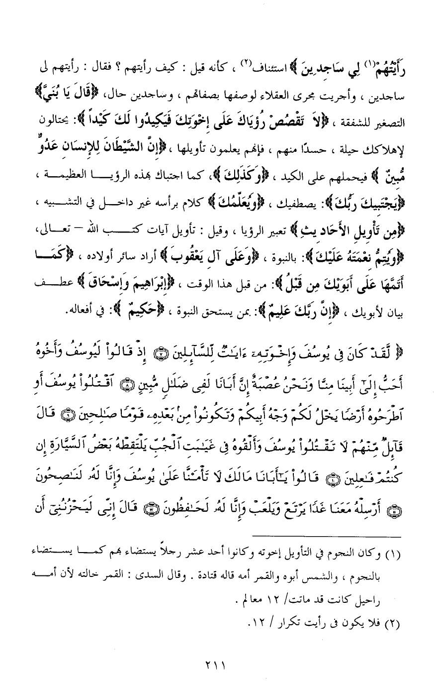(لَقَدْ كَانَ فِي يُوسُفَ وَإِخْوَتِهِ آيَاتٌ لِلسَّائِلِينَ (7) إِذْ قَالُوا لَيُوسُفُ وَأَخُوهُ أَحَبُّ إِلَى أَبِينَا مِنَّا وَنَحْنُ عُصْبَةٌ إِنَّ أَبَانَا لَفِي ضَلَالٍ مُبِينٍ (8) اقْتُلُوا يُوسُفَ أَوِ اطْرَحُوهُ أَرْضًا يَخْلُ لَكُمْ وَجْهُ أَبِيكُمْ وَتَكُونُوا مِنْ بَعْدِهِ قَوْمًا صَالِحِينَ (9) قَالَ قَائِلٌ مِنْهُمْ لَا تَقْتُلُوا يُوسُفَ وَأَلْقُوهُ فِي غَيَابَتِ الْجُبِّ يَلْتَقِطْهُ بَعْضُ السَّيَّارَةِ إِنْ كُنْتُمْ فَاعِلِينَ (10) قَالُوا يَا أَبَانَا مَا لَكَ لَا تَأْمَنَّا عَلَى يُوسُفَ وَإِنَّا لَهُ لَنَاصِحُونَ (11) أَرْسِلْهُ مَعَنَا غَدًا يَرْتَعْ وَيَلْعَبْ وَإِنَّا لَهُ لَحَافِظُونَ (12) قَالَ إِنِّي لَيَحْزُنُنِي أَنْ