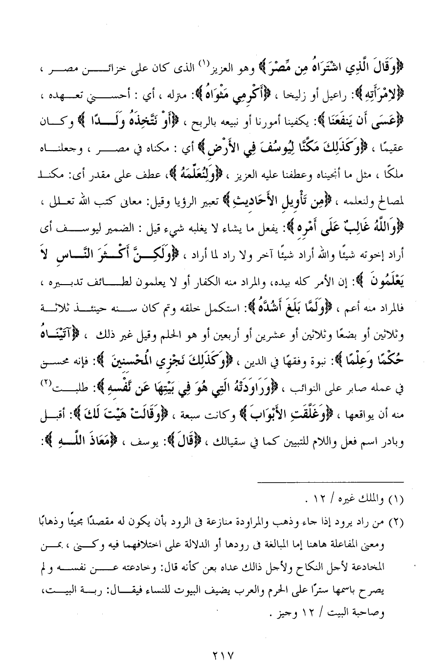 (وَقَالَ الَّذِي اشْتَرَاهُ مِنْ مِصْرَ) وهو العزيز الذي كان على خزائن مصر، (لِامْرَأَتِهِ): راعيل أو زليخا، (أَكْرِمِي مَثْوَاهُ): منزله، أي: أحسني تعهده، (عَسَى أَنْ يَنْفَعَنَا): يكفينا أمورنا أو نبيعه بالربح، (أَوْ نَتَّخِذَهُ وَلَدًا) وكان عقيمًا، (وَكَذَلِكَ مَكَّنَّا لِيُوسُفَ فِي الْأَرْضِ) أي: مكناه في مصر، وجعلناه ملكًا، مثل ما أنجيناه وعطفنا عليه العزيز، (وَلِنُعَلِّمَهُ)، عطف على مقدر أي: مكنا لمصالح ولنعلمه، (مِنْ تَأْوِيلِ الْأَحَادِيثِ) تعبير الرؤيا وقيل: معاني كتب الله تعالى (وَاللهُ غَالِبٌ عَلَى أَمْرِهِ): يفعل ما يشاء لا يغلبه شيء قيل: الضمير ليوسف أي أراد إخوته شيئًا والله أراد شيئًا آخر ولا رادَّ لما أراد، (وَلَكِنَّ أَكْثَرَ النَّاسِ لَا يَعْلَمُونَ): إن الأمر كله بيده، والمراد منه الكفار أو لا يعلمون لطائف تدبيره، فالمراد منه أعم، (وَلَمَّا بَلَغَ أَشُدَّهُ): استكمل خلقه وتم كان سنه حينئذ ثلاثة وثلاثين أو بضعًا وثلاثين أو عشرين أو أربعين أو هو الحلم وقيل غير ذلك، (آتَيْنَاهُ حُكْمًا): نبوة وفقهًا في الدين، (وَعِلْمًا وَكَذَلِكَ نَجْزِي الْمُحْسِنِينَ): فإنه محسن في عمله صابر على النوائب، (وَرَاوَدَتْهُ الَّتِي هُوَ فِي بَيْتِهَا عَنْ نَفْسِهِ): طلبت منه أن يواقعها، (وَغَلَّقَتِ الأَبْوَابَ) وكانت سبعة، (وَقَالَتْ هَيْتَ لَكَ): أقبل وبادِر اسم فعل واللام للتبيين كما في سقيا لك، (قَالَ): يوسف، (مَعَاذَ اللهِ):