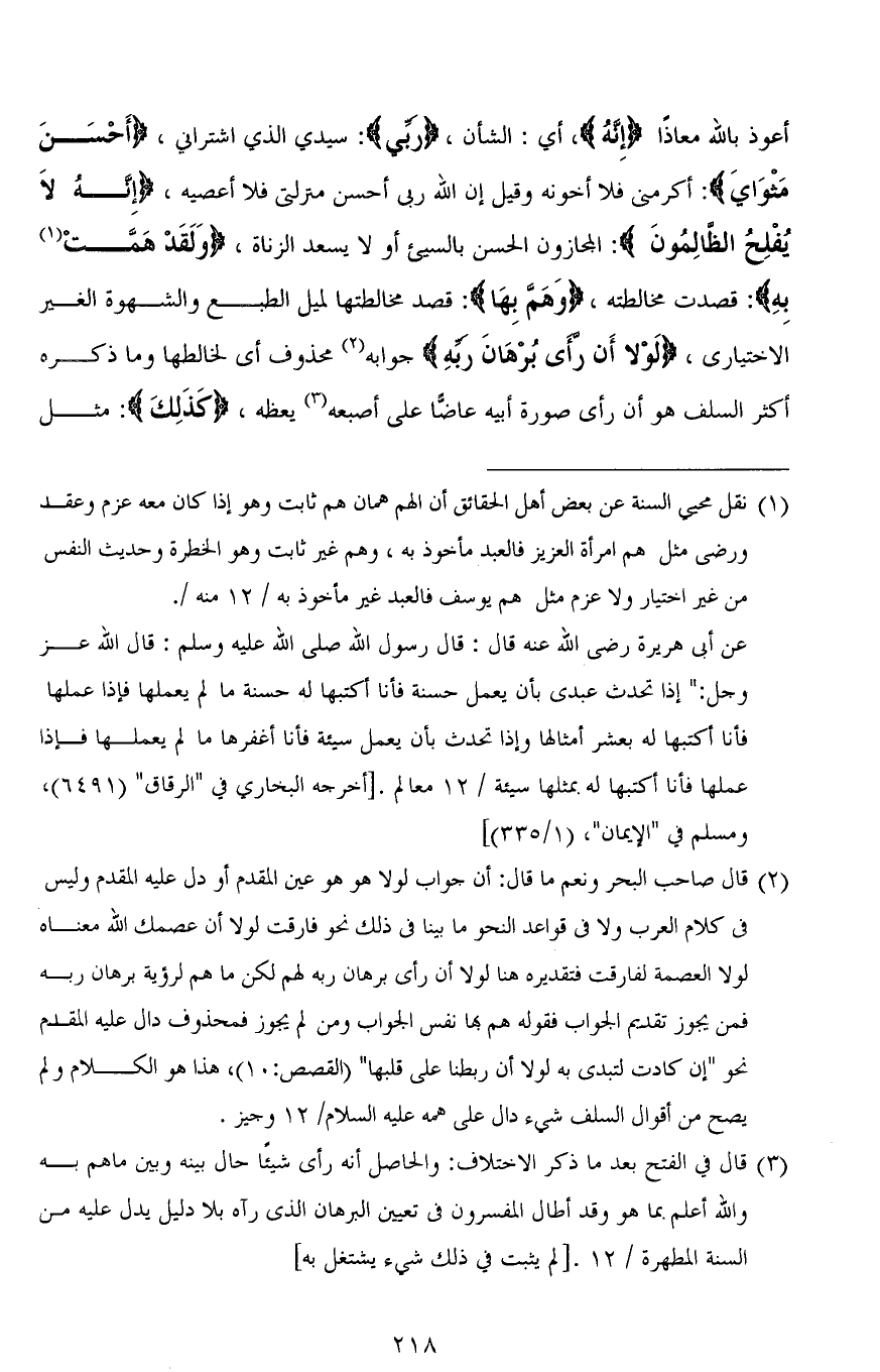 أعوذ بالله معاذًا (إِنَّهُ)، أي: الشأن، (ربي): سيدي الذي اشتراني، (أَحْسَن مَثْوَايَ): أكرمني فلا أخونه وقيل إن الله ربى أحسن منزلتي فلا أعصيه (1)، (إِنَّهُ لَا يُفْلِحُ الظَّالِمُونَ): المجازون الحسن بالسيئ أو لا يسعد الزناة، (وَلَقَدْ هَمَّتْ به): قصدت مخالطته، (وَهَمَّ بِهَا): قصد مخالطتها لميل الطبع والشهوة الغير الاختياري (2)، (لَوْلَا أَنْ رَأَى بُرْهَانَ رَبِّهِ) جوابه محذوف أي لخالطها وما ذكره أكثر السلف هو أن رأى صورة أبيه عاضًّا على أصبعه يعظه، (كَذَلِكَ): مثل