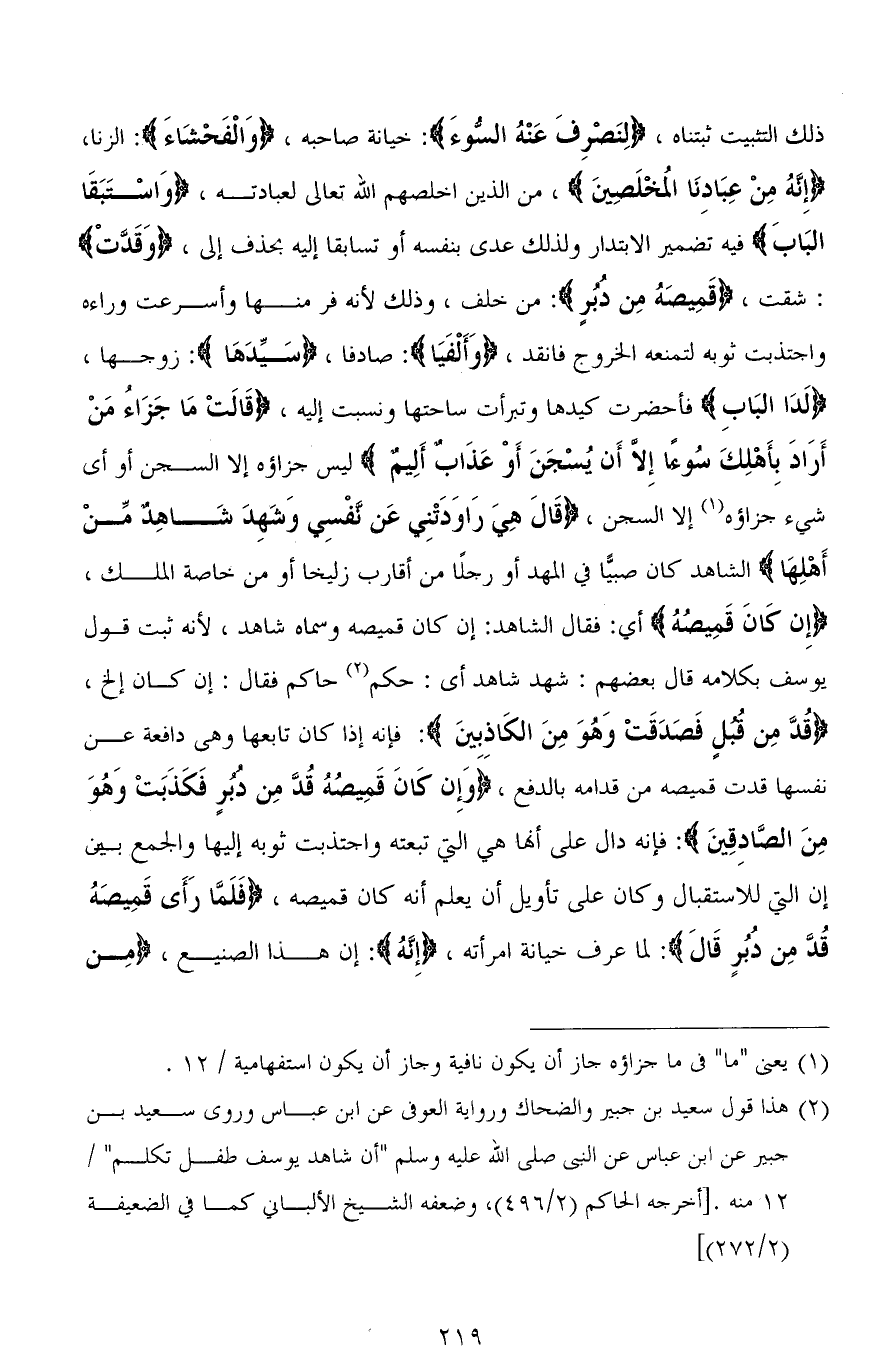 ذلك التثبيت ثبتناه، (لِنَصْرِفَ عَنْهُ السُّوءَ): خيانة صاحبه، (وَالْفَحْشَاءَ): الزنا، (إِنَّهُ مِنْ عِبَادِنَا الُمخْلَصِينَ)، من الذين أخلصهم الله تعالى لعبادته، (وَاسْتَبَقَا الْبَابَ) فيه تضمير الابتدار ولذلك عدي بنفسه أو تسابقا إليه بحذف إلى، (وَقَدَّتْ): شقت، (قَمِيصَهُ مِنْ دُبُرٍ): من خلف، وذلك لأنه فر منها وأسرعت وراءه واجتذبت ثوبه لتمنعه الخروج فانقد، (وَأَلْفَيَا): صادفا، (سَيِّدَهَا): زوجها، (لَدَا الْبَابِ) فأحضرت كيدها وبرأت ساحتها ونسبت إليه، (قَالَتْ مَا جَزَاءُ مَنْ أَرَادَ بِأَهْلِكَ سُوءًا إِلَّا أَنْ يُسْجَنَ أَوْ عَذَابٌ أَلِيمٌ) جزاؤه إلا السجن أو أي شيء جزاؤه إلا السجن، (قَالَ هِيَ رَاوَدَتْنِي عَنْ نَفْسِي وَشَهِدَ شَاهِدٌ مِنْ أَهْلِهَا) الشاهد كان صبيًّا في المهد أو وجلًا من أقارب زليخا أو من خاصة الملك، (إِنْ كَانَ قَمِيصُهُ) أي: فقال الشاهد: إن كان قميصه وسماه شاهدًا، لأنه ثبت قول يوسف بكلامه قال بعضهم: شهد شاهد أي: حكم حاكم فقال: إن كان إلخ، (قُدَّ مِنْ قُبُلٍ فَصَدَقَتْ وَهُوَ مِنَ الْكَاذِبِينَ): فإنه إذا كان تابعها وهي دافعة عن نفسها قدت قميصه من قدامه بالدفع، (وَإِنْ كَانَ قَمِيصُهُ قُدَّ مِنْ دُبُرٍ فَكَذَبَتْ وَهُوَ مِنَ الصَّادِقِينَ): فإنه دال على أنها هي التي تبعته واجتذبت ثوبه إليها والجمع بين إن التي للاستقبال وكان على تأويل أن يعلم أنه كان قميصه، (فَلَمَّا رَأَى قَمِيصَهُ قُدَّ مِنْ دُبُرٍ قَالَ): لما عرف خيانة امرأته، (إِنَّهُ): إن هذا الصنيع، (مِن