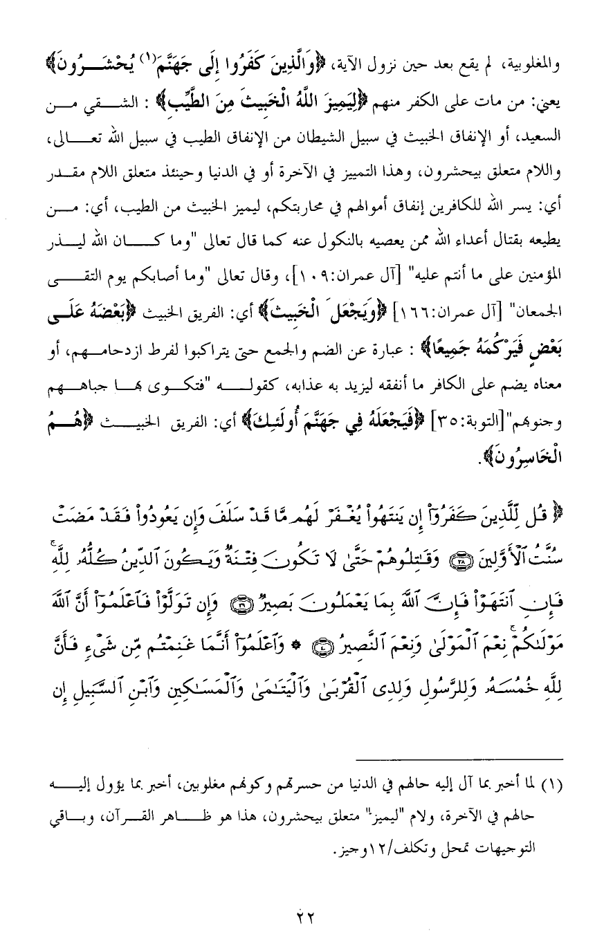 والمغلوبية، لم يقع بعد حين نزول الآية، (وَالَّذِينَ كَفَرُوا إِلَى جَهَنَّمَ يُحْشَرُون) يعني: من مات على الكفر منهم (لِيَمِيزَ اللهُ الْخَبِيثَ مِنَ الطيِّبِ): الشقي من السعيد، أو الإنفاق الخبيث في سبيل الشيطان من الإنفاق الطيب في سبيل الله تعالى، واللام متعلق بـ يحشرون، وهذا التمييز في الآخرة أو في الدنيا وحينئذ متعلق اللام مقدر أي: يسر الله للكافرين إنفاق أموالهم في محاربتكم، ليميز الخبيث من الطيب، أي: من يطيعه بقتال أعداء الله ممن يعصيه بالنكول عنه كما قال تعالى " ما كان الله ليذر المؤمنين على ما أنتم عليه " [آل عمران: 109]، وقال تعالى " وما أصابكم يوم التقى الجمعان " [آل عمران: 166] (وَيَجْعَلَ الْخَبِيثَ) أي: الفريق الخبيث (بَعْضَهُ عَلَى بَعْضٍ فَيَرْكُمَهُ جَمِيعًا): عبارة عن الضم والجمع حتى يتراكبوا لفرط ازدحامهم، أو معناه يضم على الكافر ما أنفقه ليزيد به عذابه، كقوله " فَتُكْوَى بِهَا جِبَاهُهُمْ وَجُنُوبُهُمْ " [التوبة: 35]. (فَيجْعَلَهُ في جَهَنَّمَ أُولَئِكَ) أي: الفريق الخبيث (هُم الْخَاسِرُونَ).