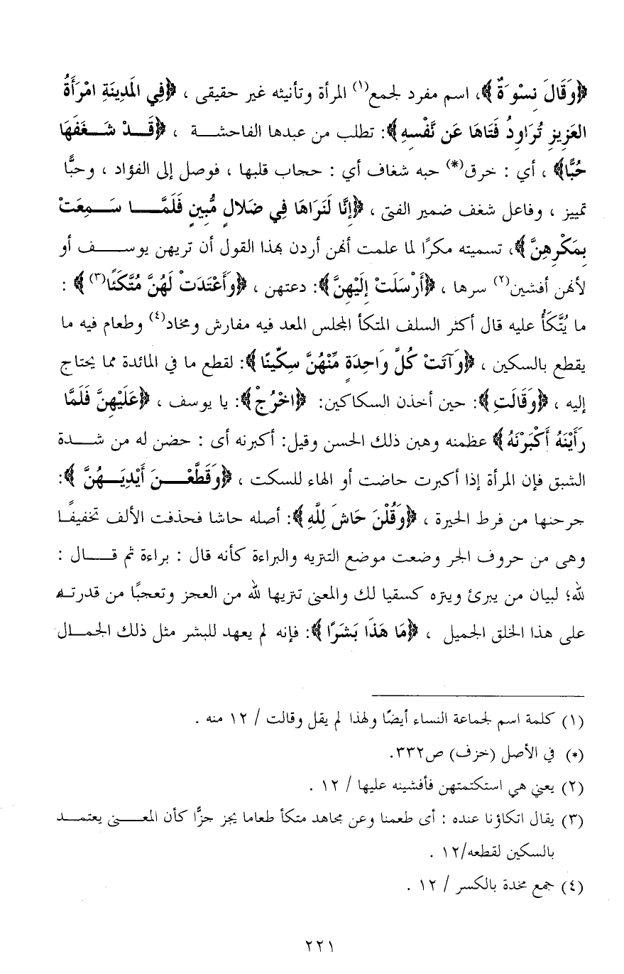 (وَقَالَ نِسْوَةٌ)، اسم مفرد لجمع المرأة وتأنيثه غير حقيقي، (فِي الْمَدِينَةِ امْرَأَتُ الْعَزِيزِ تُرَاوِدُ فَتَاهَا عَنْ نَفْسِهِ): تطلب من عبدها الفاحشة، (قَدْ شَغَفَهَا حُبًّا)، أي: خرق حبه شغاف أي: حجاب قلبها، فوصل إلى الفؤاد، و (حُبًّا) تمييز، وفاعل شغف ضمير الفتى، (إِنَّا لَنَرَاهَا فِي ضَلَالٍ مُبِينٍ (30) فَلَمَّا سَمِعَتْ بِمَكْرِهِنَّ)، تسميته مكرًا لما علمت أنهن أردن بهذا القول أن تريهن يوسف أو لأنهن أفشين سرها، (أَرْسلَتْ إِلَيْهِنَّ): دعتهن، (وَأَعْتَدَتْ لَهُنَّ مُتَّكَئًا): ما يُتَّكَأ عليه قال أكثر السلف المتكأ المجلس المعد فيه مفارش ومخاد وطعام فيه ما يقطع بالسكين، (وَآتَتْ كُلَّ وَاحِدَةٍ مِنْهُنَّ سِكِّينًا) لقطع ما في المائدة مما يحتاج إليه، (وَقَالَتِ): حين أخذن السكاكين: (اخرُج): يا يوسف، (عَلَيْهِنَّ فَلَمَّا رَأَيْنَهُ أَكْبَرْنَهُ) عظمنه وهبهن ذلك الحسن وقيل: أكبرنه أي: حضن له من شدة الشبق (1) فإن المرأة إذا أكبرت حاضت أو الهاء للسكت، (وَقَطَّعْنَ أَيْدِيَهُنَّ): جرحنها من فرط الحيرة، (وَقُلْنَ حَاشَ لله): أصله حاشا فحذفت الألف تخفيفًا وهى من حروف الجر وضعت موضع التنزيه والبراءة كأنه قال: براءة ثم قال: لله؛ لبيان من يبرئ وينزه كـ سقيا لك والمعني تنزيهًا لله من العجز وتعجبًا من قدرته على هذا الخلق الجميل، (مَا هَذا بَشَرًا): فإنه لم يعهد للبشر مثل ذلك الجمال