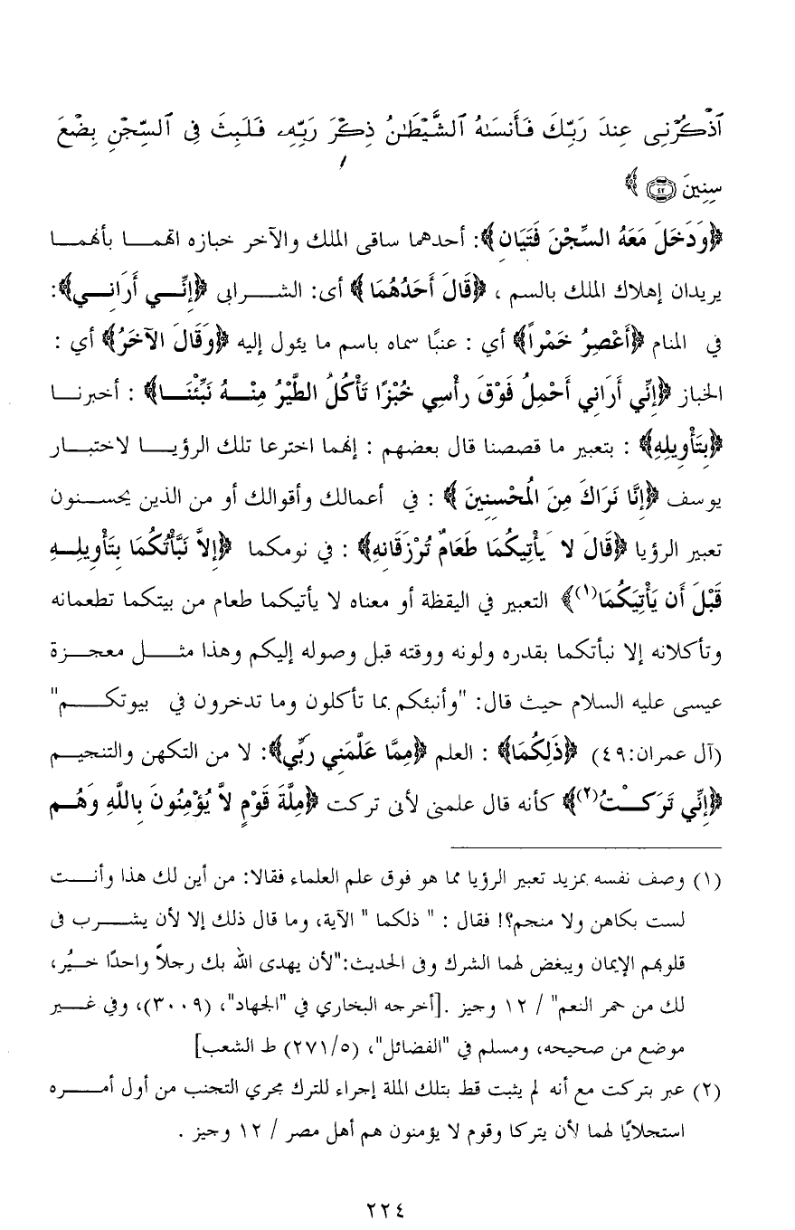 (وَدَخَلَ مَعَهُ السِّجْنَ فَتَيَانِ): أحدهما ساقي الملك والآخر خبازه اتهما بأنهما يريدان إهلاك الملك بالسُّم، (قَالَ أَحَدُهُمَا) أي: الشرابي (إِنِّي أَرَانِي): في المنام (أَعْصِرُ خَمْرًا) أي: عنبًا سماه باسم ما يئول إليه (وَقَالَ الآخرُ) أي: الخباز (إِنِّي أَرَانِي أَحْمِلُ فَوْقَ رَأْسِي خُبْزًا تَأْكُلُ الطَّيْرُ مِنْهُ نَبِّئْنَا): أخبرنا (بِتَأْوِيلِهِ): بتعبير ما قصصنا قال بعضهم: إنهما اخترعا تلك الرؤيا لاختبار يوسف (إِنَّا نَرَاكَ مِنَ الْمُحْسِنِينَ): في أعمالك وأقوالك أو من الذين يحسنون تعبير الرؤيا (قَالَ لاَ يأْتِيكُمَا طَعام تُرْزَقَانِهِ): في نومكما (إِلَّا نَبَّأْتُكُمَا بِتَأْوِيلِهِ قَبْلَ أَنْ يَأْتِيَكُمَا) التعبير في اليقظة أو معناه لا يأتيكما طعام من بيتكما تطعمانه وتأكلانه إلا نبأتكما بقدره ولونه ووقته قبل وصوله إليكم وهذا مثل معجزة عيسى عليه السلام حيث قال: (وَأُنَبِّئُكُمْ بِمَا تَأْكُلُونَ وَمَا تَدَّخِرُونَ فِي بُيُوتِكُمْ) [آل عمران: 49] (ذلِكُمَا): العلم (ذَلِكُمَا مِمَّا عَلَّمَنِي رَبِّي). لا من التكهن والتنجيم (إِنِّي تَرَكْتُ) كأنه قال علمني لأني تركت (مِلَّةَ قَوْمٍ لَا يُؤْمِنُونَ بِاللهِ وَهُمْ