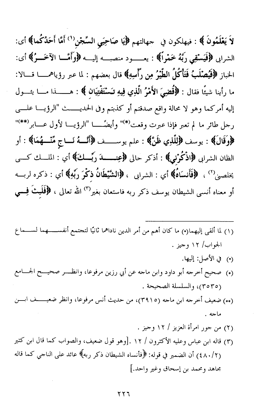 لَا يَعْلَمُونَ): فيهلكون في جهالتهم (يَا صَاحِبَي السجْنِ أَمَّا أَحَدُكُما) أي: الشرابي (فَيَسْقِي رَبَّهُ خَمْرًا): يعود منصبه إليه (وَأَمَّا الآخَرُ) أي: الخباز (فَيُصْلَبُ فَتَأْكُلُ الطَّيْرُ مِنْ رَأْسِهِ) قال بعضهم: لما عبر رؤياهما قالا: ما رأينا شيئًا فقال: (قُضِيَ الْأَمْرُ الَّذِي فِيهِ تَسْتَفْتِيَانِ): هذا ما يئول إليه أمركما وهو لا محالة واقع صدقتم أو كذبتم وفي الحديث " الرؤيا على رجل طائر ما لم تعبر فإذا عبرت وقعت، وأيضًا " الرؤيا لأول عابر " (وَقَالَ): يوسف (لِلَّذِي ظَنَّ): علم يوسف (أَنَّهُ نَاجٍ مِنْهُمَا): أو الظان الشرابي (اذْكُرْنِي): اذكر حالي (عِنْدَ رَبِّكَ) أي: الملك كي يخلصني، (فَأَنْسَاهُ) أي: الشرابي، (الشَّيْطَانُ ذِكْرَ رَبِّهِ) أي: ذكره لربه أو معناه أنسى الشيطان يوسف ذكر ربه فاستعان بغير الله تعالى (1)، (فَلَبِثَ فِي
