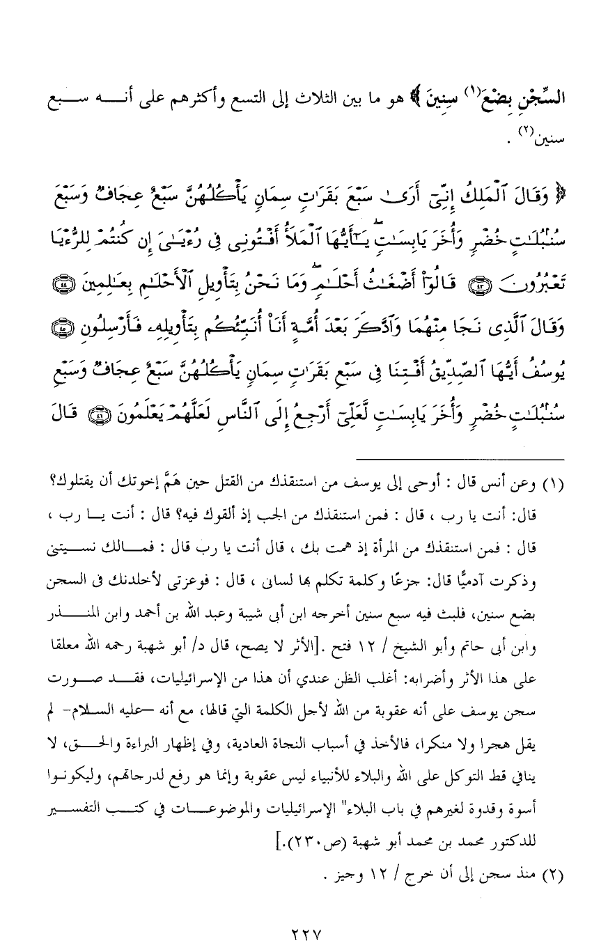 (وَقَالَ الْمَلِكُ إِنِّي أَرَى سَبْعَ بَقَرَاتٍ سِمَانٍ يَأْكُلُهُنَّ سَبْعٌ عِجَافٌ وَسَبْعَ سُنْبُلَاتٍ خُضْرٍ وَأُخَرَ يَابِسَاتٍ يَا أَيُّهَا الْمَلَأُ أَفْتُونِي فِي رُؤْيَايَ إِنْ كُنْتُمْ لِلرُّؤْيَا تَعْبُرُونَ (43) قَالُوا أَضْغَاثُ أَحْلَامٍ وَمَا نَحْنُ بِتَأْوِيلِ الْأَحْلَامِ بِعَالِمِينَ (44) وَقَالَ الَّذِي نَجَا مِنْهُمَا وَادَّكَرَ بَعْدَ أُمَّةٍ أَنَا أُنَبِّئُكُمْ بِتَأْوِيلِهِ فَأَرْسِلُونِ (45) يُوسُفُ أَيُّهَا الصِّدِّيقُ أَفْتِنَا فِي سَبْعِ بَقَرَاتٍ سِمَانٍ يَأْكُلُهُنَّ سَبْعٌ عِجَافٌ وَسَبْعِ سُنْبُلَاتٍ خُضْرٍ وَأُخَرَ يَابِسَاتٍ لَعَلِّي أَرْجِعُ إِلَى النَّاسِ لَعَلَّهُمْ يَعْلَمُونَ (46)