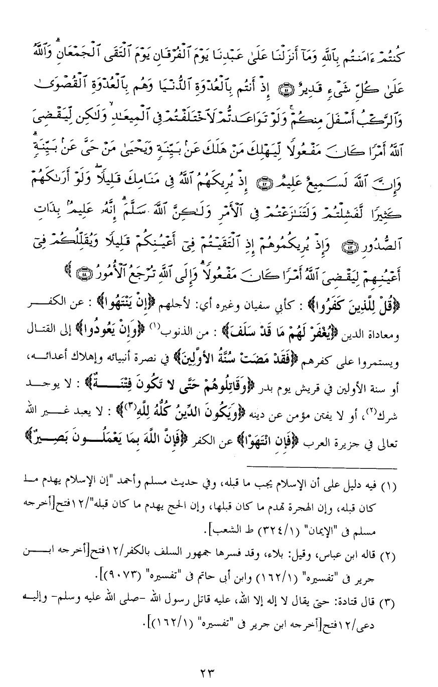 (قُلْ لِلَّذِينَ كَفَرُوا): كأبي سفيان وغيره أي: لأجلهم (إِنْ يَنْتَهُوا): عن الكفر ومعاداة الدين (يُغْفَرْ لَهُمْ مَا قَدْ سَلَفَ): من الذنوب (وَإِنْ يَعُودُوا) إلى القتال ويستمروا على كفرهم (فَقَدْ مَضَتْ سُنَّتُ الْأَوَّلِينَ) في نصرة أنبيائه وإهلاك أعدائه، أو سنة الأولين في قريش يوم بدر (وَقَاتِلُوهُمْ حَتَّى لَا تَكُونَ فِتْنَةٌ): لا يوجد شرك، أو لا يفتن مؤمن عن دينه (وَيَكُونَ الدِّينُ كُلُّهُ لله): لا يعبد غير الله تعالى في جزيرة العرب (فَإِنِ انْتَهَوْا) عن الكفر (فَإِنَّ اللهَ بِمَا يَعْمَلُونَ بَصِيرٌ)