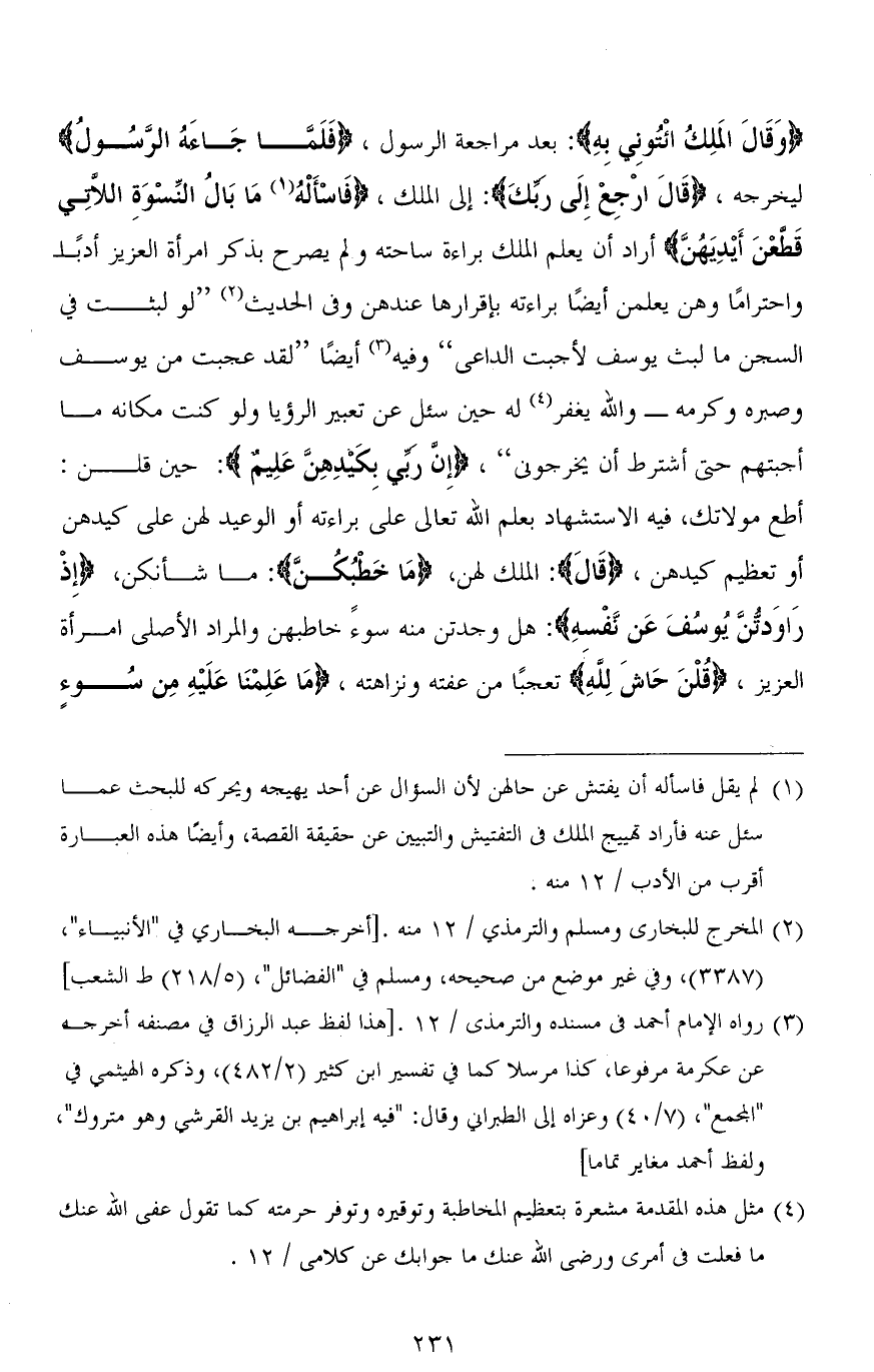 (وَقَالَ المَلِكُ ائْتُونِي بِهِ): بعد مراجعة الرسول، (فَلَمَّا جَاءَهُ الرَّسُولُ) ليخرجه، (قَالَ ارْجِعْ إِلَى ربِّكَ): إلى الملك، (فَاسْأَلْهُ مَا بَالُ النِّسْوَةِ اللَّاتِي قَطَّعْنَ أَيْدِيَهُنَّ) أراد أن يعلم الملك براءة ساحته ولم يصرح بذكر امرأة العزيز أدبًا واحترامًا وهن يعلمن أيضًا براءته بإقرارها عندهن وفي الحديث " لو لبثت في السجن ما لبث يوسف لأجبت الداعى " وفيه أيضًا " لقد عجبت من يوسف وصبره وكرمه - والله يغفر له حين سئل عن تعبير الرؤيا ولو كنت مكانه ما أجبتهم حتى أشترط أن يخرجوني "، (إِنَّ رَبِّي بِكَيْدِهِنَّ عَلِيمٌ): حين قلن: أطع مولاتك، فيه الاستشهاد بعلم الله تعالى على براءته أو الوعيد لهن على كيدهن أو تعظيم كيدهن، (قَالَ): الملك لهن، (ما خَطْبُكُنَّ): ما شأنكن، (إِذْ رَاوَدتُّنَّ يُوسُفَ عَن نَّفْسهِ): هل وجدتن منه سوءً خاطبهن والمراد الأصلي امرأة العزيز، (قُلْنَ حَاشَ لله) تعجبًا من عفته ونزاهته، (مَا عَلِمْنَا عَلَيْهِ مِن سُوءٍ