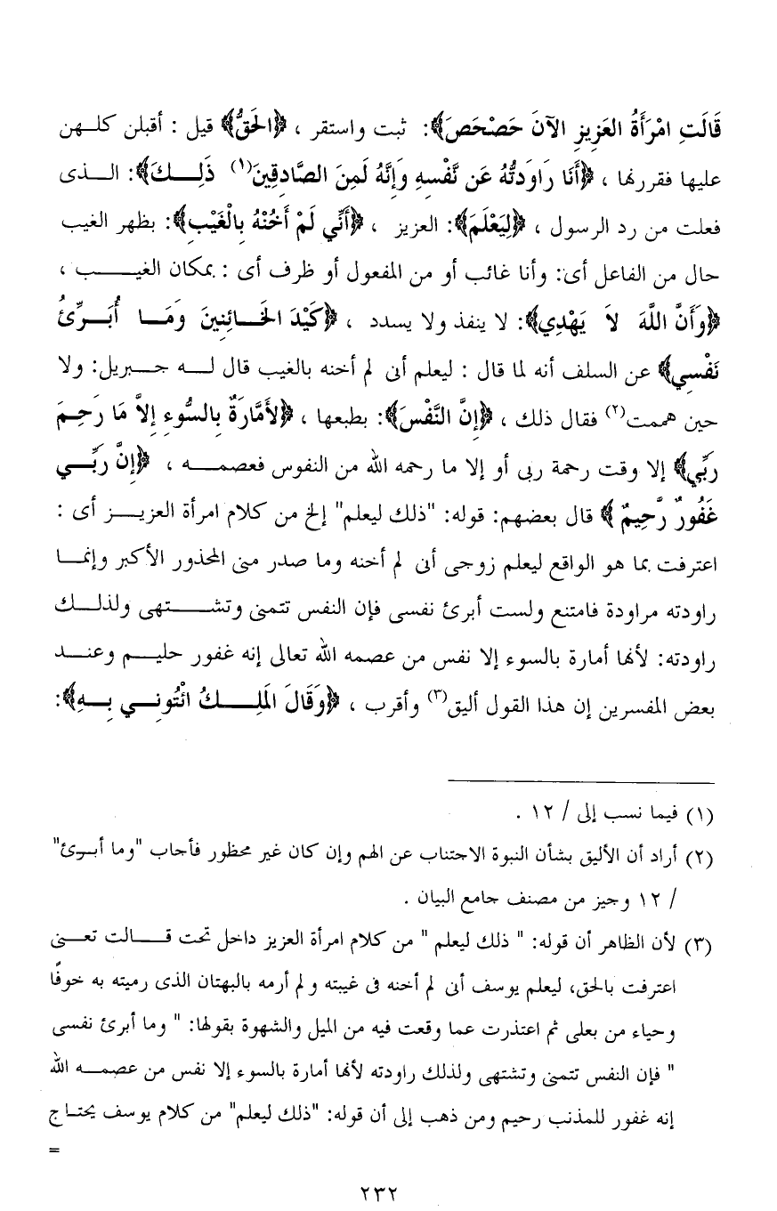 (1) لا يصح والذي عليه المحققون أن قوله تعالى (ذَلِكَ لِيَعْلَمَ أَنِّي لَمْ أَخُنْهُ بِالْغَيْبِ وَأَنَّ اللهَ لَا يَهْدِي كَيْدَ الْخَائِنِينَ (52) وَمَا أُبَرِّئُ نَفْسِي إِنَّ النَّفْسَ لَأَمَّارَةٌ بِالسُّوءِ إِلَّا مَا رَحِمَ رَبِّي) من كلام امرأة العزيز، وهو ما ذكره المصنف بعد ذلك فتأمله.