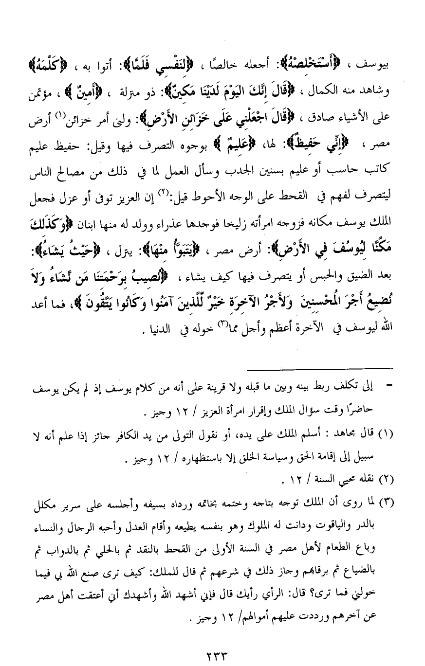 بيوسف)، (أَسْتَخْلصْهُ): أجعله خالصًا، (لنَفْسِي فَلَمَّا): أتوا به، (كَلَّمَهُ) وشاهد منه الكمالَ، (قَالَ إِنَّكَ الْيَوْمَ لَدَيْنَا مَكِينٌ): ذو منزلة، (أَمِينٌ)، مؤتمن على الأشياء صادق، (قَالَ اجْعَلْنِي عَلَى خَزَائِنِ الأَرْضِ): ولنى أمر خزائن أرض مصر، (إِنِّي حَفِيظٌ): لها، (عَليمٌ) بوجوه التصرف فيها وقيل: حفيظ عليم كاتب حاسب أو عليم بسنين الجدب وسأل العمل لما في ذلك من مصالح الناس ليتصرف لفهم في القحط على الوجه الأحوط قيل: إن العزيز توفي أو عزل فجعل الملك يوسف مكانه فزوجه امرأته زليخا فوجدها عذراء وولد له منها ابنان (وَكَذَلِكَ مَكَّنَّا لِيُوسُفَ فِي الْأَرْضِ): أرض مصر، (يَتَبَوَّأُ مِنْهَا): ينزل، (حَيْثُ يَشَاءُ): بعد الضيق والحبس أو يتصرف فيها كيف يشاء، (نُصِيبُ بِرَحْمَتِنَا مَنْ نَشَاءُ وَلَا نُضِيعُ أَجْرَ الْمُحْسِنِينَ (56) وَلَأَجْرُ الْآخِرَةِ خَيْرٌ لِلَّذِينَ آمَنُوا وَكَانُوا يَتَّقُونَ)، فما أعد الله ليوسف في الآخرة أعظم وأجل مما خوَّله في الدنيا.