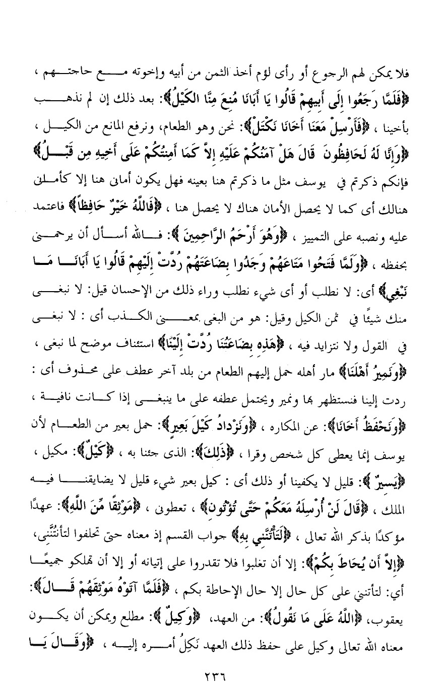 فلا يمكن لهم الرجوع أو رأى لؤم أخذ الثمن من أبيه وإخوته مع حاجتهم، (فَلَمَّا رَجَعُوا إِلَى أَبِيهِمْ قَالُوا يَا أَبَانَا مُنِعَ مِنَّا الْكَيْلُ): بعد ذلك إن لم نذهب بأخينا، (فَأَرْسِلْ مَعَنَا أَخَانَا نَكْتَلْ): نحن وهو الطعام، ونرفع المانع من الكيل، (وَإِنَّا لَهُ لَحَافِظُونَ (63) قَالَ هَلْ آمَنُكُمْ عَلَيْهِ إِلا كَمَا أَمِنتُكُمْ عَلَى أَخِيهِ مِن قَبْلُ) فإنكم ذكرتم في يوسف مثل ما ذكرتم هنا بعينه فهل يكون أماني هنا إلا كأماني هنالك أي كما لا يحصل الأمان هناك لا يحصل هنا، (فَاللهُ خَيْرٌ حَافِظًا) فأعتمد عليه ونصبه على التمييز، (وَهُوَ أَرْحَمُ الرَّاحِمِينَ): فالله أسأل أن يرحمني بحفظه، (وَلَمَّا فَتَحُوا مَتَاعَهُمْ وَجَدُوا بِضَاعَتَهُمْ رُدَّتْ إِلَيْهِمْ قَالُوا يَا أَبَانَا مَا نَبْغِي) أي: لا نطلب أو أي شيء نطلب وراء ذلك من الإحسان قيل: لا نبغي منك شيئًا في ثمن الكيل وقيل: هو من البغي بمعنى الكذب أي: لا نبغي في القول ولا نتزايد فيه، (هَذِهِ بِضَاعَتُنَا رُدَّتْ إِلَيْنَا) استئناف موضح لما نبغي، (وَنَمِيرُ أَهْلَنَا) مار أهله حمل إليهم الطعام من بلد آخر عطف على محذوف أي: ردت إلينا فنستظهر بها ونمير ويحتمل عطفه على ما [نبغي] إذا كانت نافية، (وَنَحْفَظُ أَخَانَا): عن المكاره، (وَنَزْدَادُ كَيْلَ بَعِيرٍ): حمل بعير من الطعام لأن يوسف إنما يعطي كل شخص وقرًا، (ذَلِكَ): الذي جئنا به، (كَيْلٌ): مكيل، (يَسِيرٌ): قليل لا يكفينا أو ذلك أي: كيل بعير شيء قليل لا يضايقنا فيه الملك، (قَالَ لَنْ أُرْسِلَهُ مَعَكُمْ حَتَّى تُؤْتُونِ)، تعطوني، (مَوْثِقًا مِنَ اللهِ): عهدًا مؤكدًا بذكر الله تعالى، (لَتَأْتُنَّنِي بِهِ) جواب القسم إذ معناه حتى تحلفوا لَتَأْتُنَّنِي، (إِلَّا أَنْ يُحَاطَ بِكُمْ): إلا أن تغلبوا فلا تقدروا على إتيانه أو إلا أن تهلكو جميعًا أي: لتأتنني على كل حال إلا حال الإحاطة بكم، (فَلَمَّا آتَوْهُ مَوْثِقَهُمْ قَالَ): يعقوب، (اللهُ عَلَى مَا نَقُولُ): من العهد، (وَكِيلٌ): مطلع ويمكن أن يكون معناه الله تعالى وكيل على حفظ ذلك العهد نَكِلُ أمره إليه، (وَقَالَ يَا