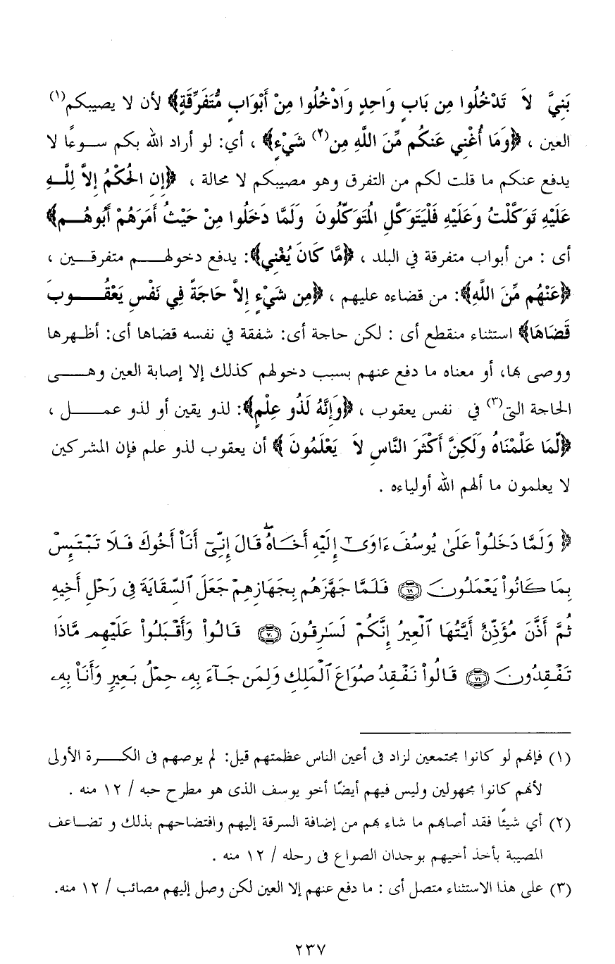 بَنِيَّ لَا تَدْخُلُوا مِنْ بَابٍ وَاحِدٍ وَادْخُلُوا مِنْ أَبْوَابٍ مُتَفَرِّقَةٍ) لأن لا يصيبكم العين، (وَمَا أُغْنِي عَنكُم مِّنَ اللهِ مِن شَيْءٍ)، أي: لو أراد الله بكم سوءًا لا يدفع عنكم ما قلت لكم من التفرق وهو مصِيبكم لا محالة، (إِنِ الْحُكْمُ إِلَّا لله عَلَيْهِ تَوَكَّلْتُ وَعَلَيْهِ فَلْيَتَوَكَّلِ الْمُتَوَكِّلُونَ (67) وَلَمَّا دَخَلُوا مِنْ حَيْثُ أَمَرَهُمْ أَبُوهُمْ) أى: من أبواب متفرقة في البلد، (مَا كَانَ يُغْنِي): يدفع دخولهم متفرقين، (عَنْهُم مَنَ اللهِ): من قضاءه عليهم، (مِن شَيْءٍ إِلا حَاجَةً فِي نَفْسِ يَعْقُوبَ قَضَاهَا) استثناء منقطع أي: لكن حاجة أي: شفقة في نفسه قضاها أي: أظهرها ووصى بما، أو معناه ما دفع عنهم بسبب دخولهم كذلك إلا إصابة العين وهي الحاجة التي في نفس يعقوب، (وَإِنَّهُ لَذُو عِلْمٍ): لذو يقين أو لذو عمل، (لِمَا عَلَّمْنَاهُ وَلَكِنَّ أَكْثَرَ النَّاسِ لَا يَعْلَمُونَ) أن يعقوب لذو علم فإن المشركين لا يعلمون ما ألهم الله أولياءه.