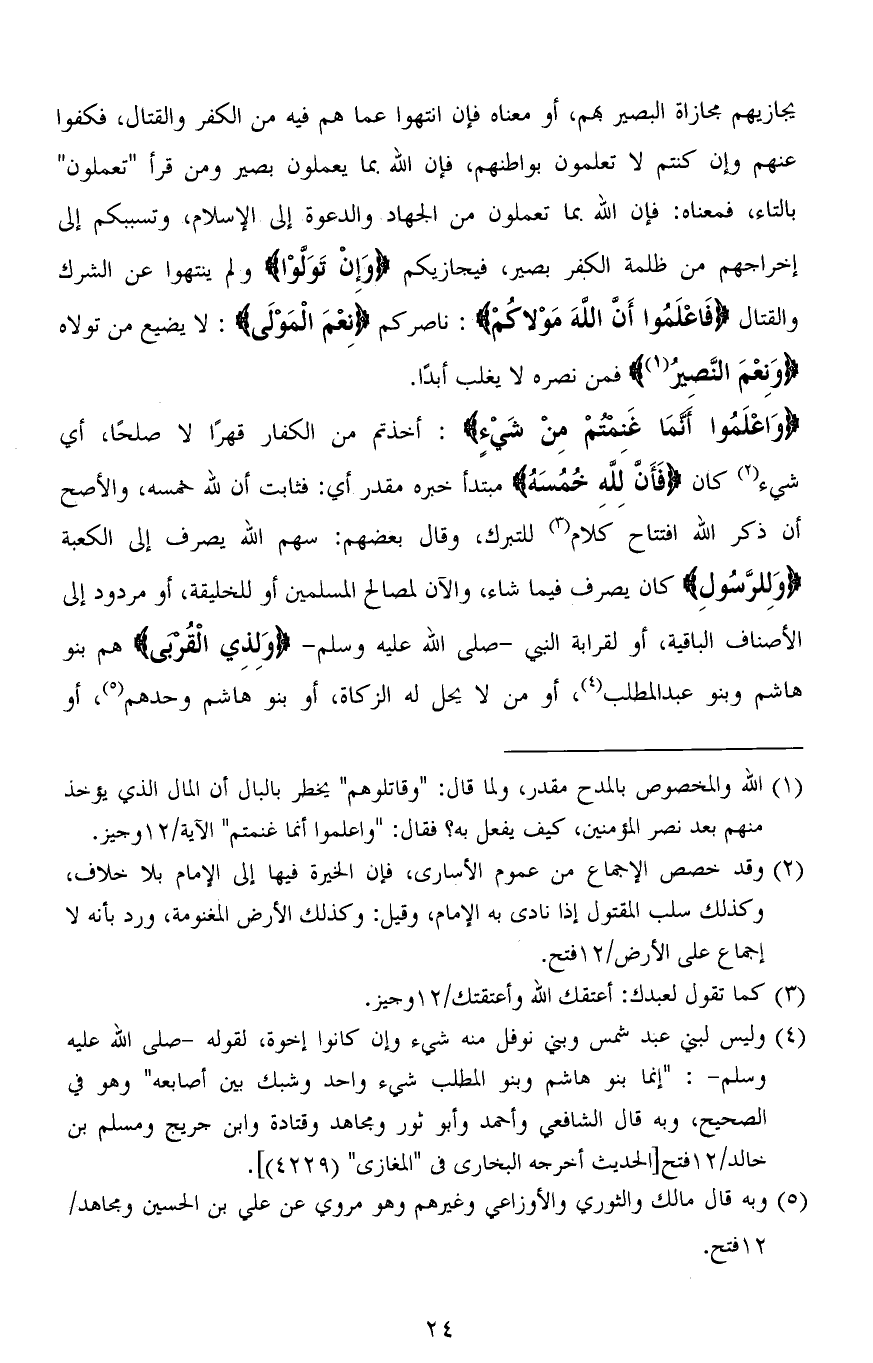 (وَاعْلَمُوا أَنَّمَا غَنِمْتُمْ مِنْ شَيْءٍ): أخذتم من الكفار قهرًا لا صلحًا، أي شيء كان (فأَن لله خُمُسَهُ) مبتدأ خبره مقدر أي: فثابت أن لله خمسه، والأصح أن ذكر الله افتتاح كلام للتبرك، وقال بعضهم: سهم الله يصرف إلى الكعبة (وَلِلرَّسُولِ) كان يصرف فيما شاء، والآن لمصالح المسلمين أو للخليفة، أو مردود إلى الأصناف الباقية، أو لقرابة النبي - صلى الله عليه وسلم - (وَلِذِي الْقُربى) هم بنو هاشم وبنو عبد المطلب، أو من لا يحل له الزكاة، أو بنو هاشم وحدهم، أو