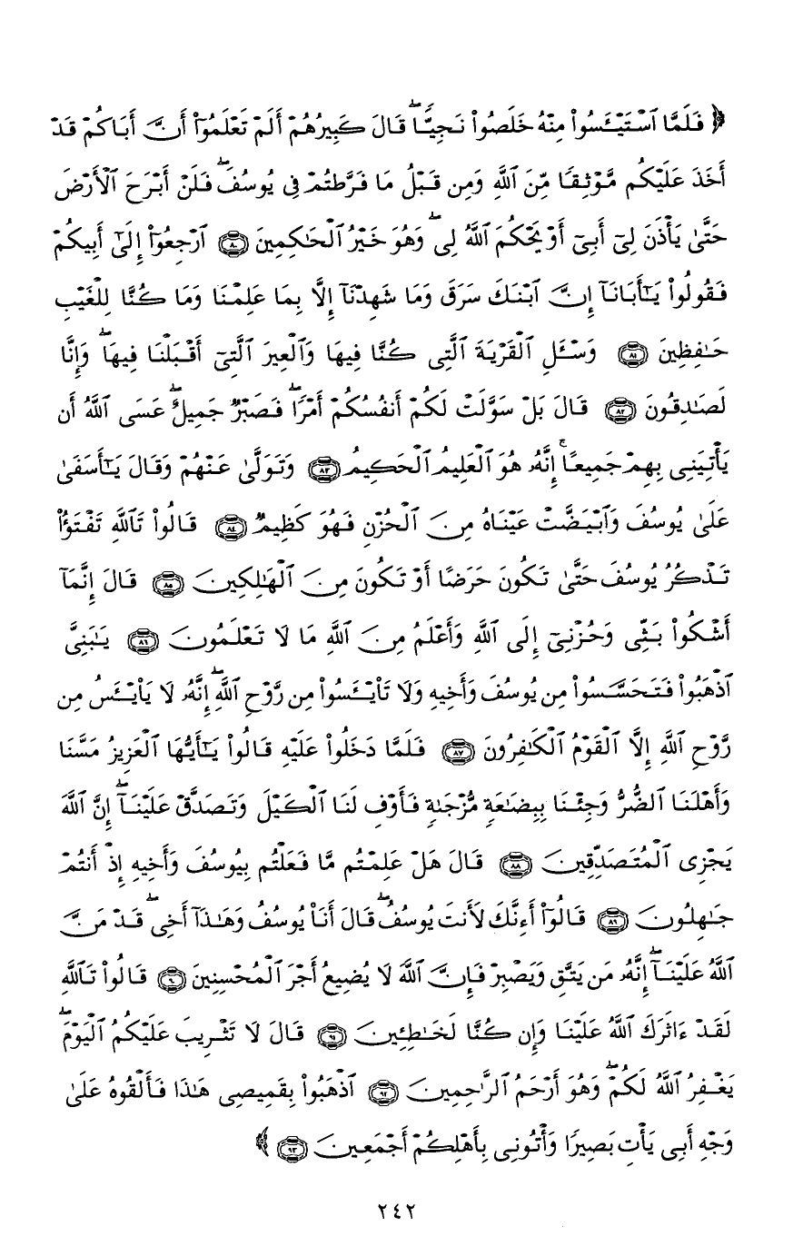 (فَلَمَّا اسْتَيْأَسُوا مِنْهُ خَلَصُوا نَجِيًّا قَالَ كَبِيرُهُمْ أَلَمْ تَعْلَمُوا أَنَّ أَبَاكُمْ قَدْ أَخَذَ عَلَيْكُمْ مَوْثِقًا مِنَ اللهِ وَمِنْ قَبْلُ مَا فَرَّطْتُمْ فِي يُوسُفَ فَلَنْ أَبْرَحَ الْأَرْضَ حَتَّى يَأْذَنَ لِي أَبِي أَوْ يَحْكُمَ اللهُ لِي وَهُوَ خَيْرُ الْحَاكِمِينَ (80) ارْجِعُوا إِلَى أَبِيكُمْ فَقُولُوا يَا أَبَانَا إِنَّ ابْنَكَ سَرَقَ وَمَا شَهِدْنَا إِلَّا بِمَا عَلِمْنَا وَمَا كُنَّا لِلْغَيْبِ حَافِظِينَ (81) وَاسْأَلِ الْقَرْيَةَ الَّتِي كُنَّا فِيهَا وَالْعِيرَ الَّتِي أَقْبَلْنَا فِيهَا وَإِنَّا لَصَادِقُونَ (82) قَالَ بَلْ سَوَّلَتْ لَكُمْ أَنْفُسُكُمْ أَمْرًا فَصَبْرٌ جَمِيلٌ عَسَى اللهُ أَنْ يَأْتِيَنِي بِهِمْ جَمِيعًا إِنَّهُ هُوَ الْعَلِيمُ الْحَكِيمُ (83) وَتَوَلَّى عَنْهُمْ وَقَالَ يَا أَسَفَى عَلَى يُوسُفَ وَابْيَضَّتْ عَيْنَاهُ مِنَ الْحُزْنِ فَهُوَ كَظِيمٌ (84) قَالُوا تَاللهِ تَفْتَأُ تَذْكُرُ يُوسُفَ حَتَّى تَكُونَ حَرَضًا أَوْ تَكُونَ مِنَ الْهَالِكِينَ (85) قَالَ إِنَّمَا أَشْكُو بَثِّي وَحُزْنِي إِلَى اللهِ وَأَعْلَمُ مِنَ اللهِ مَا لَا تَعْلَمُونَ (86) يَا بَنِيَّ اذْهَبُوا فَتَحَسَّسُوا مِنْ يُوسُفَ وَأَخِيهِ وَلَا تَيْأَسُوا مِنْ رَوْحِ اللهِ إِنَّهُ لَا يَيْأَسُ مِنْ رَوْحِ اللهِ إِلَّا الْقَوْمُ الْكَافِرُونَ (87) فَلَمَّا دَخَلُوا عَلَيْهِ قَالُوا يَا أَيُّهَا الْعَزِيزُ مَسَّنَا وَأَهْلَنَا الضُّرُّ وَجِئْنَا بِبِضَاعَةٍ مُزْجَاةٍ فَأَوْفِ لَنَا الْكَيْلَ وَتَصَدَّقْ عَلَيْنَا إِنَّ اللهَ يَجْزِي الْمُتَصَدِّقِينَ (88) قَالَ هَلْ عَلِمْتُمْ مَا فَعَلْتُمْ بِيُوسُفَ وَأَخِيهِ إِذْ أَنْتُمْ جَاهِلُونَ (89) قَالُوا أَإِنَّكَ لَأَنْتَ يُوسُفُ قَالَ أَنَا يُوسُفُ وَهَذَا أَخِي قَدْ مَنَّ اللهُ عَلَيْنَا إِنَّهُ مَنْ يَتَّقِ وَيَصْبِرْ فَإِنَّ اللهَ لَا يُضِيعُ أَجْرَ الْمُحْسِنِينَ (90) قَالُوا تَاللهِ لَقَدْ آثَرَكَ اللهُ عَلَيْنَا وَإِنْ كُنَّا لَخَاطِئِينَ (91) قَالَ لَا تَثْرِيبَ عَلَيْكُمُ الْيَوْمَ يَغْفِرُ اللهُ لَكُمْ وَهُوَ أَرْحَمُ الرَّاحِمِينَ (92) اذْهَبُوا بِقَمِيصِي هَذَا فَأَلْقُوهُ عَلَى وَجْهِ أَبِي يَأْتِ بَصِيرًا وَأْتُونِي بِأَهْلِكُمْ أَجْمَعِينَ (93)
