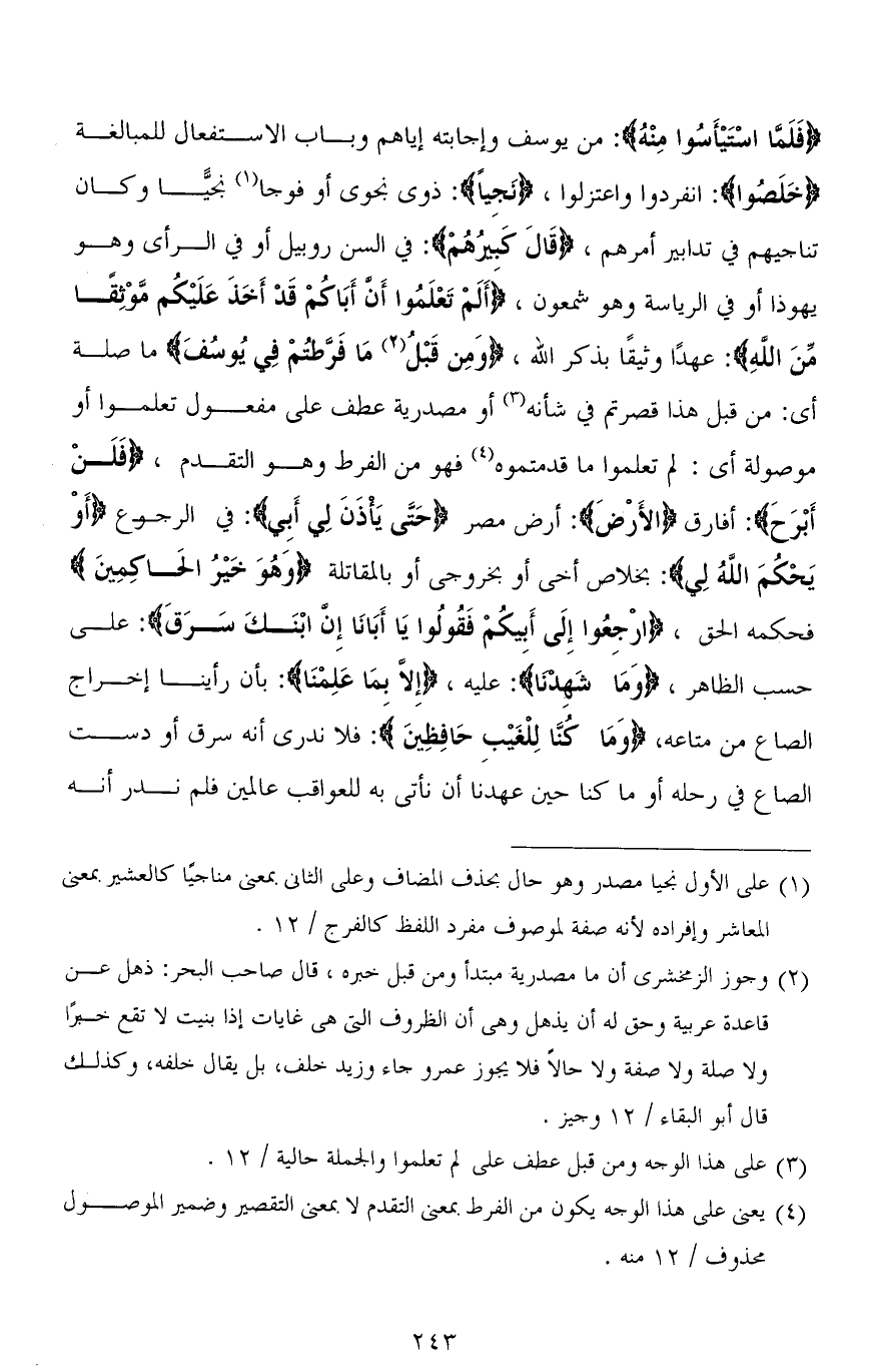 (فَلَما اسْتَيْأَسُوا مِنْهُ): من يوسف وإجابته إياهم وباب الاستفعال للمبالغة (خَلَصُوا): انفردوا واعتزلوا، (نَجِيًّا): ذوي نجوى أو فوجا نجيًّا وكان تناجيهم في تدابير أمرهم، (قَالَ كَبِيرُهُمْ): في السن روبيل أو في الرأي وهو يهوذا أو في الرياسة وهو شمعون، (أَلَمْ تَعْلَمُوا أَنَّ أَبَاكُمْ قَدْ أَخَذَ عَلَيْكُم مَّوْثِقًا مِّنَ اللهِ): عهدًا وثيقًا بذكر الله، (وَمِنْ قَبْلُ مَا فَرَّطْتُمْ فِي يُوسُفَ) ما صلة أى: من قبل هذا قصرتم في شأنه أو مصدرية عطف على مفعول تعلموا أو موصولة أي: لم تعلموا ما قدمتموه فهو من الفرط وهو التقدم، (فَلَنْ أَبْرَحَ): أفارق (الأَرْضَ): أرض مصر (حَتَّى يَأذَنَ لِي أَبِي): في الرجوع (أَوْ يَحْكُمَ اللهُ لِي): بخلاص أخي أو بخروجي أو بالمقاتلة (وَهُوَ خَيْرُ الحَاكِمِينَ) فحكمه الحق، (ارْجِعُوا إِلَى أَبيكُمْ فَقُولُوا يَا أَبَانَا إِنَّ ابْنَكَ سَرَقَ): على حسب الظاهر، (وَمَا شَهِدنا): عليه، (إِلا بمَا عَلِمْنَا): بأن رأينا إخراج الصاع من متاعه، (وَمَا كُنَّا لِلْغَيْبِ حَافِظِينَ): فلا ندري أنه سرق أو دست الصاع في رحله أو ما كنا حين عهدنا أن نأتي به للعواقب عالمين فلم ندر أنه