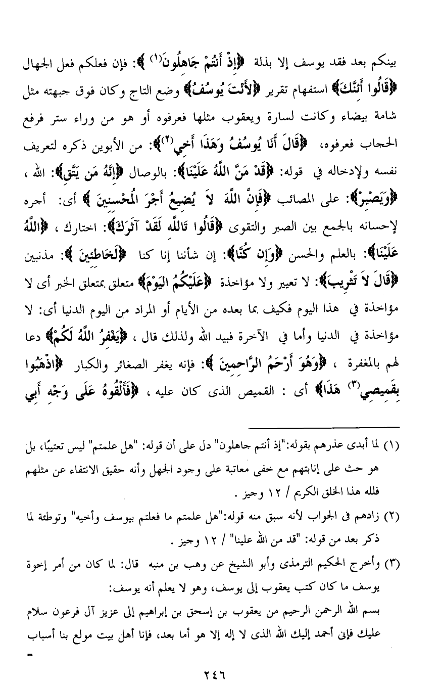 بينكم بعد فقد يوسف إلا بذلة (إِذْ أَنتمْ جَاهلُونَ): فإن فعلكم فعل الجهال (قَالُوا أَئِنَّكَ) استفهام تقرير (لأَنتَ يُوسُفُ) وضع التاج وكان فوق جبهته مثل شامة بيضاء وكانت لسارة ويعقوب مثلها فعرفوه أو هو من وراء ستر فرفع الحجاب فعرفوه، (قَالَ أَنَا يُوسُفُ وَهَذَا أَخِي): من الأبوين ذكره لتعريف نفسه ولإدخاله في قوله: (قَدْ مَنَّ اللهُ عَلَيْنَا): بالوصال (إِنَّهُ مَن يَتَّقِ): الله، (وَيَصْبِرْ): على المصائب (فَإِنَّ اللهَ لَا يُضِيعُ أَجْرَ الْمُحْسِنِينَ) أي: أجره لإحسانه بالجمع بين الصبر والتقوى (قَالُوا تَاللهِ لَقَدْ آثَرَكَ): اختارك، (اللهُ عَلَيْنَا): بالعلم والحسن (وَإِنْ كُنَّا): إن شأننا إنا كنا (لَخَاطِئِينَ): مذنبين (قَالَ لاَ تَثْرِيبَ): لا تعيير ولا مؤاخذة (عَلَيْكُمُ اليَوْمَ) متعلق بمتعلق الخبر أي لا مؤاخذة في هذا اليوم فكيف بما بعده من الأيام أو المراد من اليوم الدنيا أي: لا مؤاخذة في الدنيا وأما في الآخرة فبِيَدِ الله ولذلك قال، (يَغْفِرُ اللهُ لَكُمْ) دعا لهم بالمغفرة، (وَهُوَ أَرْحَمُ الرَّاحِمِينَ): فإنه يغفر الصغائر والكبار (اذْهَبُوا بِقَمِيصِي هَذَا) أي: القميص الذي كان عليه، (فَأَلْقُوهُ عَلَى وَجْهِ أَبِي