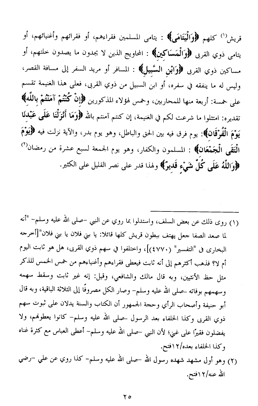 قريش كلهم (وَالْيَتَامَى): يتامى المسلمين فقراءهم، أو فقرائهم وأغنيائهم، أو يتامى ذوي القربى (وَالْمَسَاكِينِ): المحاويج الذين لا يجدون ما يصدون خلتهم، أو مساكين ذوى القربى (وَابْنِ السَّبيلِ): المسافر أو مريد السفر إلى مسافة القصر، وليس له ما ينفقه في سفره، أو ابن السبيل من ذوي القربى، فعلى هذا الغنيمة تقسم على خمسة: أربعة منها للمحاربين، وخمس لهؤلاء المذكورين (إِنْ كُنْتُمْ آمَنْتُمْ بِاللهِ) تقديره: امتثلوا ما شرعت لكم في الغنيمة، إِنْ كُنْتُمْ آمَنْتُمْ بِاللهِ (وَمَا أَنْزَلْنَا عَلَى عَبْدِنَا يَوْمَ الْفُرْقَانِ): يوم فرق فيه بين الحق والباطل، وهو يوم بدر، والآية نزلت فيه (يَوْمَ الْتَقَى الْجَمْعَانِ): المسلمون والكفار، وهو يوم الجمعة لسبع عشرة من رمضان (وَاللهُ عَلَى كَلِّ شَيْءٍ قَدِيرٌ) ولهذا قدر على نصر القليل على الكثير.