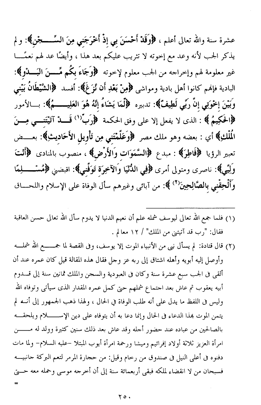 عشرة سنة والله تعالى أعلم، (وَقَدْ أَحْسَنَ بِي إِذْ أَخْرَجَنِي مِنَ السِّجْنِ): ولم يذكر الْجُبَّ لأنه وعد مع إخوته لا تثريب عليكم بعد هذا، وأيضًا عد لهم نعمًا غير معلومة لهم وإخراجه من الْجُبِّ معلوم لإخوته (وَجَاءَ بِكُم مِّنَ البَدْوِ): البادية فإنهم كانوا أهل بادية ومواشي (مِنْ بَعْدِ أَن نَزَغَ): أفسد (الشَّيْطَانُ بَيْنِي وَبَيْنَ إِخْوَتِي إِنَّ رَبِّي لَطِيفٌ): تدبيره (لِمَا يَشَاءُ إِنَّهُ هُوَ الْعَلِيمُ): بالأمور (الحَكِيمُ): الذي لا يفعل إلا على وفق الحكمة (رَبِّ قَدْ آتَيْتَنِي مِنَ الْمُلْكِ) أي: بعضه وهو ملك مصر (وَعَلَّمْتَنِي مِنْ تَأْوِيلِ الْأَحَادِيثِ): بعض تعبير الرؤيا (فَاطِرَ): مبدع (السَّمَاوَاتِ وَالأَرْضِ)، منصوب بالمنادى (أَنتَ وَلِيِّي): ناصري ومتولي أمري (فِي الدُّنْيَا وَالْآخِرَةِ تَوَفَّنِي): اقبضني (مُسْلِمًا وَأَلْحِقْنِي بِالصَّالِحِينَ): من آبائى وغيرهم سأل الوفاة على الإسلام واللحاق