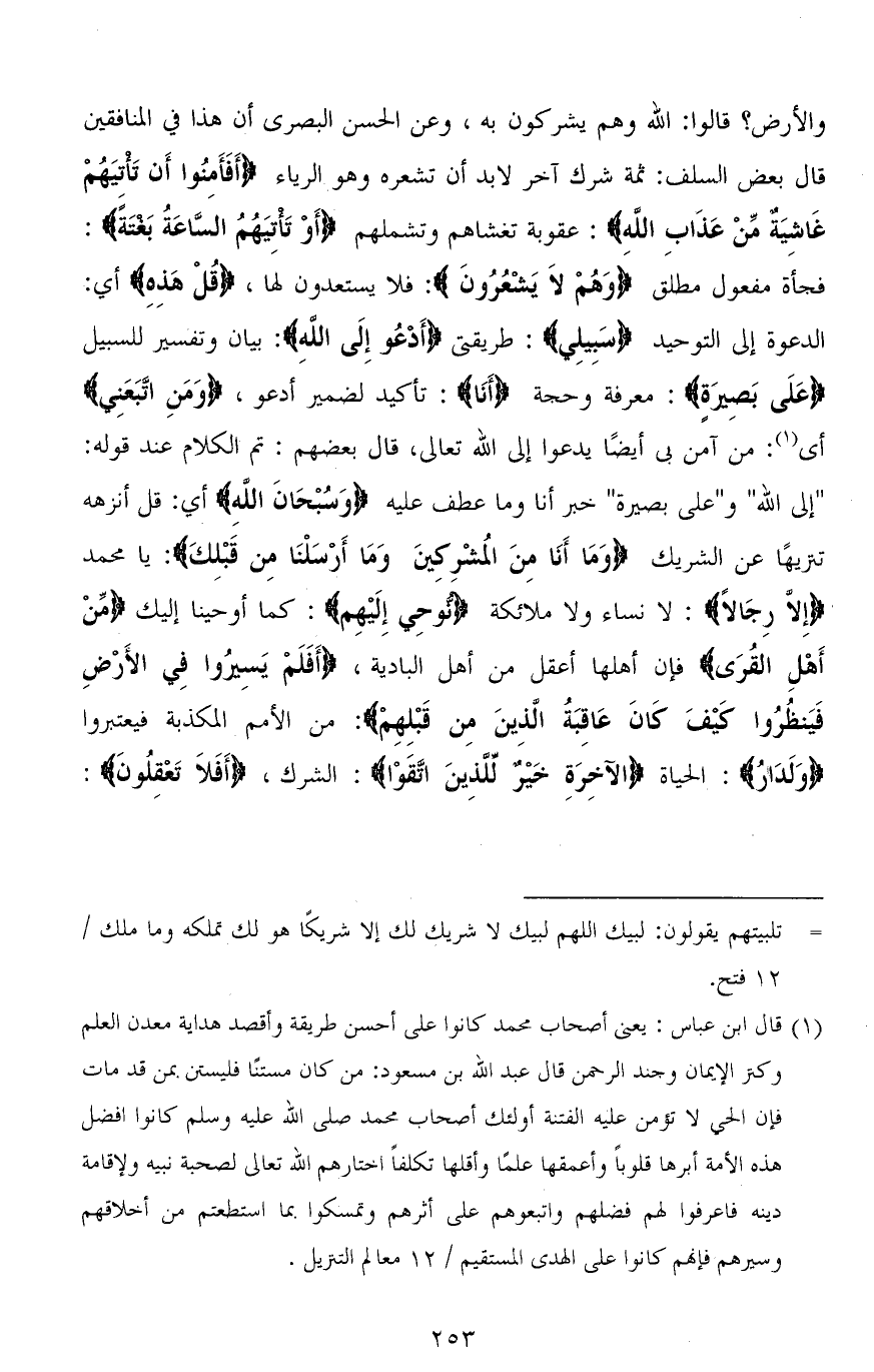 والأرض؟ قالوا: الله وهم يشركون به، وعن الحسن البصري أن هذا في المنافقين قال بعض السلف: ثمة شرك آخر لابد أن تشعره وهو الرياء (أَفَأَمِنُوا أَن تَأتِيَهُمْ غَاشيَةٌ منْ عَذَابِ اللهِ): عقوبة تغشاهم وتشملهم (أَوْ تَأتِيَهُمُ السَّاعَةُ بَغتَةً): فجأَة مفعول مطلق (وَهُمْ لاَ يَشْعُرُونَ): فلا يستعدون لها، (قُلْ هَذِهِ) أي: الدعوة إلى التوحيد (سَبِيلِي): طريقتي (أَدْعُو إِلَى اللهِ): بيان وتفسير للسبيل (عَلَى بَصِيرَةٍ): معرفة وحجة (أَنَا): تأكيد لضمير أدعو، (وَمَنِ اتَّبَعَنِي) أى: من آمن بى أيضًا يدعوا إلى الله تعالى، قال بعضهم: تم الكلام عند قوله: (إلى الله) و (على بصيرة) خبر (أنا) وما عطف عليه (وَسُبْحَانَ اللهِ) أي: قل أنزهه تنزيهًا عن الشريك (وَمَا أَنَا مِنَ الْمُشْرِكِينَ (108) وَمَا أَرْسَلْنَا مِن قَبْلِكَ): يا محمد (إِلَّا رِجَالًا): لا نساء ولا ملائكة (نُوحِي إِلَيْهِمْ): كما أوحينا إليك (مِّنْ أَهْلِ القُرَى) فإن أهلها أعقل من أهل البادية، (أَفَلَمْ يَسِيرُوا فِي الْأَرْضِ فَيَنْظُرُوا كَيْفَ كَانَ عَاقِبَةُ الَّذِينَ مِنْ قَبْلِهِمْ): من الأمم المكذبة فيعتبروا (وَلَدَارُ): الحياة (الآخِرَةِ خَيرٌ لِلَّذِينَ اتَّقَوْا): الشرك، (أَفَلَا تَعْقِلُونَ):