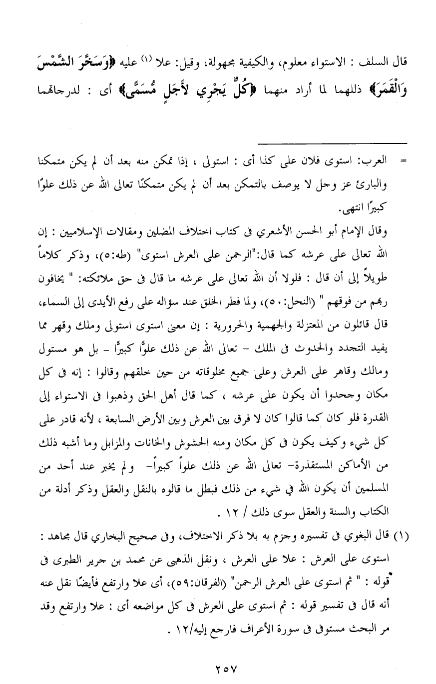 قال السلف: الاستواء معلوم، والكيفية مجهولة، وقيل: علا عليه (وَسَخَّرَ الشَّمْسَ وَالْقَمَرَ) ذللهما لما أراد منهما (كُلٌّ يَجْرِي لأَجَلٍ مسَمًّى) أي: لدرجاتهما