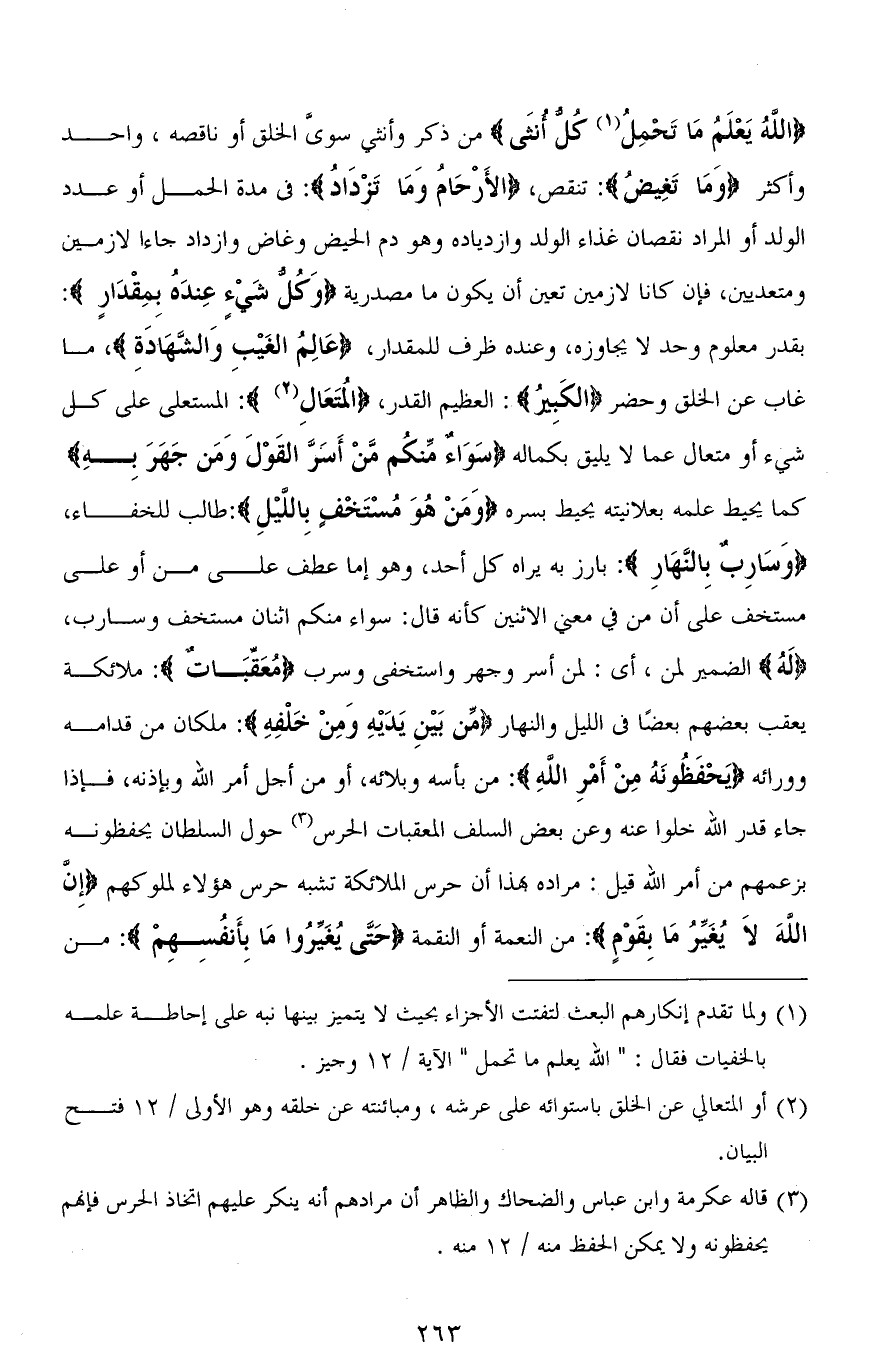 (اللهُ يَعْلَمُ مَا تَحْمِلُ كُلُّ أُنْثَى) من ذكر وأنثى سوى الخلق أو ناقصه، واحد وأكثر (وَمَا تَغِيضُ): تنقص، (الْأَرْحَامُ وَمَا تَزْدَادُ): في مدة الحمل أو عدد الولد أو المراد نقصان غذاء الولد وازدياده وهو دم الحيض وغاض وازداد جاءا لازمين ومتعديين، فإن كانا لازمين تعين أن يكون ما مصدرية (وَكُلُّ شَيْءٍ عِنْدَهُ بِمِقْدَارٍ): بقدر معلوم وحد لا يجاوزه، وعنده ظرف للمقدار، (عَالِمُ الغَيبِ وَالشَّهَادَةِ)، ما غاب عن الخلق وحضر (الكَبِيرُ): العظيم القدر، (الْمُتَعَالِ): المستعلي على كل شيء أو متعال عما لا يليق بكماله (سَوَاءٌ مِنْكُمْ مَنْ أَسَرَّ الْقَوْلَ وَمَنْ جَهَرَ بِهِ) كما يحيط علمه بعلانيته يحيط بسره (وَمَنْ هُوَ مُسْتَخْفٍ بِاللَّيْلِ): طالب للخفاء، (وَسَارِبٌ بِالنَّهَارِ): بارز به يراه كل أحد، وهو إما عطف على من أو على مستخف على أن من في معنى الاثنين كأنه قال: سواء منكم اثنان مستخف وسارب، (له) الضمير لمن، أي: لمن أسر وجهر واستخفى وسرب (مُعَقِّبَاتٌ): ملائكة يعقب بعضهم بعضًا في الليل والنهار (مِّن بَيْنِ يَدَيْهِ وَمِنْ خَلْفِهِ): ملكان من قدامه وورائه (يَحْفَظُونهُ مِنْ أَمْرِ اللهِ): من بأسه وبلائه، أو من أجل أمر الله وبإذنه، فإذا جاء قدر الله خلوا عنه وعن بعض السلف المعقبات الحرس حول السلطان يحفظونه بزعمهم من أمر الله قيل: مراده بهذا أن حرس الملائكة تشبه حرس هؤلاء لملوكهم (إِنَّ اللهَ لَا يُغَيِّرُ مَا بِقَوْمٍ): من النعمة أو النقمة (حَتَّى يُغَيِّرُوا مَا بِأَنْفُسِهِمْ): من