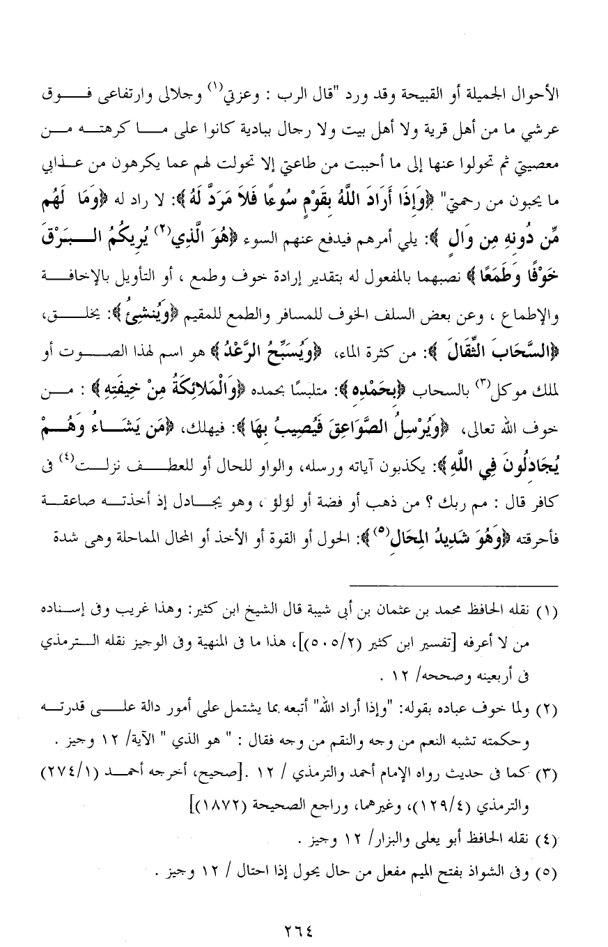 الأحوال الجميلة أو القبيحة وقد ورد " قال الرب: وعزتي وجلالي وارتفاعي فوق عرشي ما من أهل قرية ولا أهل بيت ولا رجال ببادية كانوا على ما كرهته من معصيتي ثم تحولوا عنها إلى ما أحببت من طاعتي إلا تحولت لهم عما يكرهون من عذابي ما يحبون من رحمتي " (وَإِذَا أَرَادَ اللهُ بِقَوْمٍ سُوءًا فَلَا مَرَدَّ لَهُ): لا راد له (وَمَا لَهُم مِّن دُونِهِ مِن وَالٍ): يلي أمرهم فيدفع عنهم السوء (هُوَ الّذِي يُرِيكُمُ البَرْقَ خَوْفًا وَطَمَعًا) نصبهما بالمفعول له بتقدير إرادة خوف وطمع، أو التأويل بالإخافة والإطماع، وعن بعض السلف الخوف للمسافر والطمع للمقيم (وَيُنْشِئُ): يخلق، (السَّحَابَ الثِّقَالَ): من كثرة الماء، (وَيُسَبِّحُ الرَّعْدُ) هو اسم لهذا الصوت أو لملك موكل بالسحاب (بِحَمْدِهِ): متلبسًا بحمده (وَالْمَلَائِكَةُ مِنْ خِيفَتِهِ): من خوف الله تعالى، (وَيُرْسِلُ الصَّوَاعِقَ فَيُصِيبُ بِهَا): فيهلك، (مَن يَشَاءُ وَهُمْ وَهُمْ يُجَادِلُونَ فِي اللهِ) يكذبون آياته ورسله، والواو للحال أو للعطف نزلت في كافر قال: مم ربك؟ من ذهب أو فضة أو لؤلؤ، وهو يجادل إذ أخذته صاعقة فأحرقته (وَهُوَ شَدِيدُ الْمِحَالِ): الحول أو القوة أو الأخذ أو المحال المماحلة وهي شدة