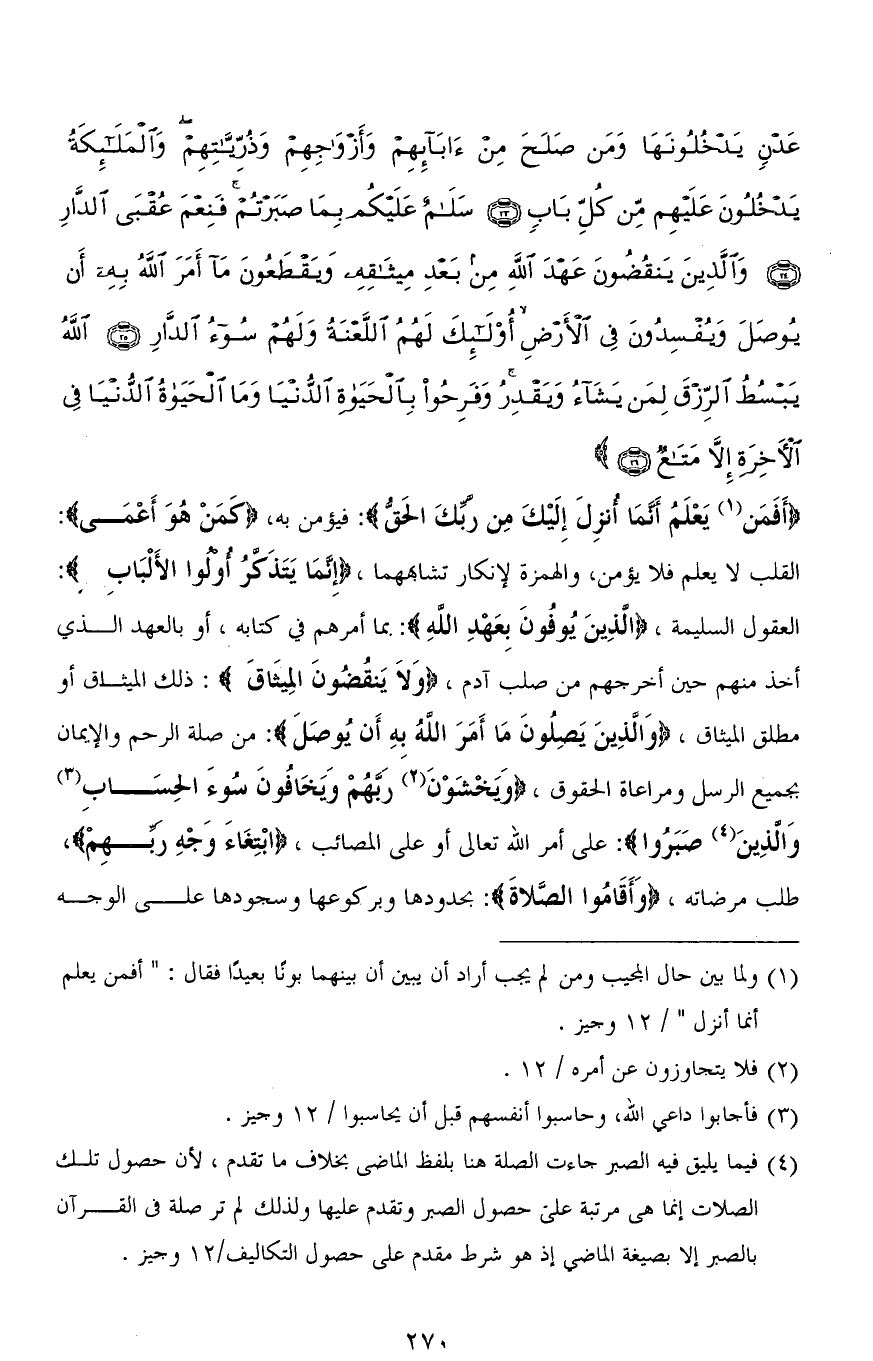 (أَفَمَنْ يَعْلَمُ أَنَّمَا أُنْزِلَ إِلَيْكَ مِنْ رَبِّكَ الْحَقُّ): فيؤمن به، (كَمَنْ هُوَ أَعْمَى): القلب لا يعلم فلا يؤمن، والهمزة لإنكار تشابهما، (إِنَّمَا يَتَذَكَّرُ أُولُو الْأَلْبَابِ): العقول السليمة، (الذِينَ يُوفُونَ بِعَهْدِ اللهِ): بما أمرهم في كتابه، أو بالعهد الذي أخذ منهم حين أخرجهم من صلب آدم، (وَلَا يَنْقُضُونَ الْمِيثَاقَ): ذلك الميثاق أو مطلق الميثاق، (وَالَّذِينَ يَصِلُونَ مَا أَمَرَ اللهُ بهِ أَن يُوصَلَ): من صلة الرحم والإيمان بجميع الرسل ومراعاة الحقوق، (وَيَخْشَوْنَ رَبَّهُمْ وَيَخَافُونَ سُوءَ الحِسَابِ وَالَّذِينَ صَبَرُوا): على أمر الله تعالى أو على المصائب، (ابْتِغَاءَ وَجْهِ رَبِّهِمْ)، طلب مرضاته، (وَأَقَامُوا الصَّلاةَ): بحدودها وبركوعها وسجودها على الوجه