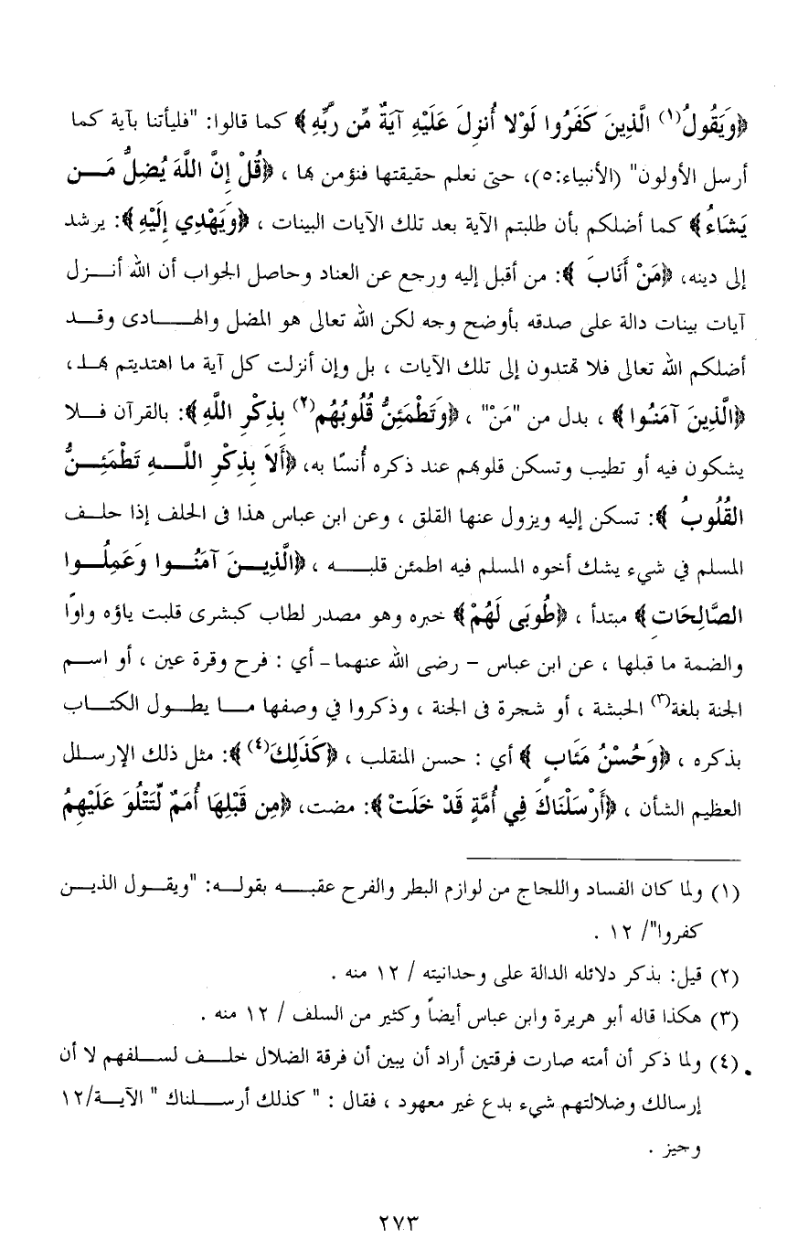 (وَيَقُولُ الَّذِينَ كَفَرُوا لَوْلَا أُنْزِلَ عَلَيْهِ آيَةٌ مِنْ رَبِّهِ) كما قالوا: (فَلْيَأْتِنَا بِآيَةٍ كَمَا أُرْسِلَ الْأَوَّلُونَ) [الأنبياء: 5]، حتى نعلم حقيقتها فنؤمن بها، (قُلْ إِنَّ اللهَ يُضِلُّ مَنْ يَشَاءُ) كما أضلكم بأن طلبتم الآية بعد تلك الآيات البينات، (ويَهْدِي إِلَيْهِ): يرشد إلى دينه (مَنْ أَنَابَ): من أقبل إليه ورجع عن العناد وحاصل الجواب أن الله أنزل آيات بينات دالة على صدقه بأوضح وجه لكن الله تعالى هو المضل والهادي وقد أضلكم الله تعالى فلا تهتدون إلى تلك الآيات، بل وإن أنزلت كل آية ما اهتديتم بها، (الَّذِينَ آمَنوا)، بدل من " مَنْ "، (وَتَطْمَئِنُّ قُلُوبُهُم بذِكرِ اللهِ): بالقرآن فلا يشكون فيه أو تطيب وتسكن قلوبهم عند ذكره أُنسًا به، (أَلَا بِذِكْرِ اللهِ تَطْمَئِنُّ الْقُلُوبُ): تسكن إليه ويزول عنها القلق، وعن ابن عباس هذا في الحلف إذا حلف المسلم في شيء يشك أخوه المسلم فيه اطمئن قلبه، (الَّذِينَ آمَنُوا وَعَمِلُوا الصَّالِحَاتِ) مبتدأ، (طُوبَى لَهُمْ) خبره وهو مصدر لطاب كبشرى قلبت ياؤه واوًا [لضمة ما قبلها] (1)، عن ابن عباس - رضى الله عنهما - أي: فرح وقرة عين، أو اسم الجنة بلغة الحبشة، أو شجرة في الجنة، وذكروا في وصفها ما يطول الكتاب بذكره، (وَحُسْنُ مَآبٍ) أي: حسن النقلب، (كَذَلِكَ): مثل ذلك الإرسال العظيم الشأن، (أَرْسَلْناكً فِي أُمَّةٍ قَدْ خَلَتْ): مضت، (مِن قَبْلِهَا أُمَمٌ لتَتْلُوَ عَلَيْهِمُ