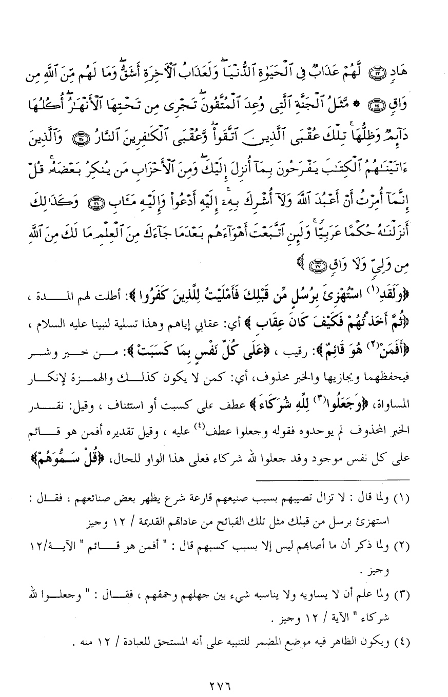 لَهُمْ عَذَابٌ فِي الْحَيَاةِ الدُّنْيَا وَلَعَذَابُ الْآخِرَةِ أَشَقُّ وَمَا لَهُمْ مِنَ اللهِ مِنْ وَاقٍ (34) مَثَلُ الْجَنَّةِ الَّتِي وُعِدَ الْمُتَّقُونَ تَجْرِي مِنْ تَحْتِهَا الْأَنْهَارُ أُكُلُهَا دَائِمٌ وَظِلُّهَا تِلْكَ عُقْبَى الَّذِينَ اتَّقَوْا وَعُقْبَى الْكَافِرِينَ النَّارُ (35) وَالَّذِينَ آتَيْنَاهُمُ الْكِتَابَ يَفْرَحُونَ بِمَا أُنْزِلَ إِلَيْكَ وَمِنَ الْأَحْزَابِ مَنْ يُنْكِرُ بَعْضَهُ قُلْ إِنَّمَا أُمِرْتُ أَنْ أَعْبُدَ اللهَ وَلَا أُشْرِكَ بِهِ إِلَيْهِ أَدْعُو وَإِلَيْهِ مَآبِ (36) وَكَذَلِكَ أَنْزَلْنَاهُ حُكْمًا عَرَبِيًّا وَلَئِنِ اتَّبَعْتَ أَهْوَاءَهُمْ بَعْدَمَا جَاءَكَ مِنَ الْعِلْمِ مَا لَكَ مِنَ اللهِ مِنْ وَلِيٍّ وَلَا وَاقٍ (37)