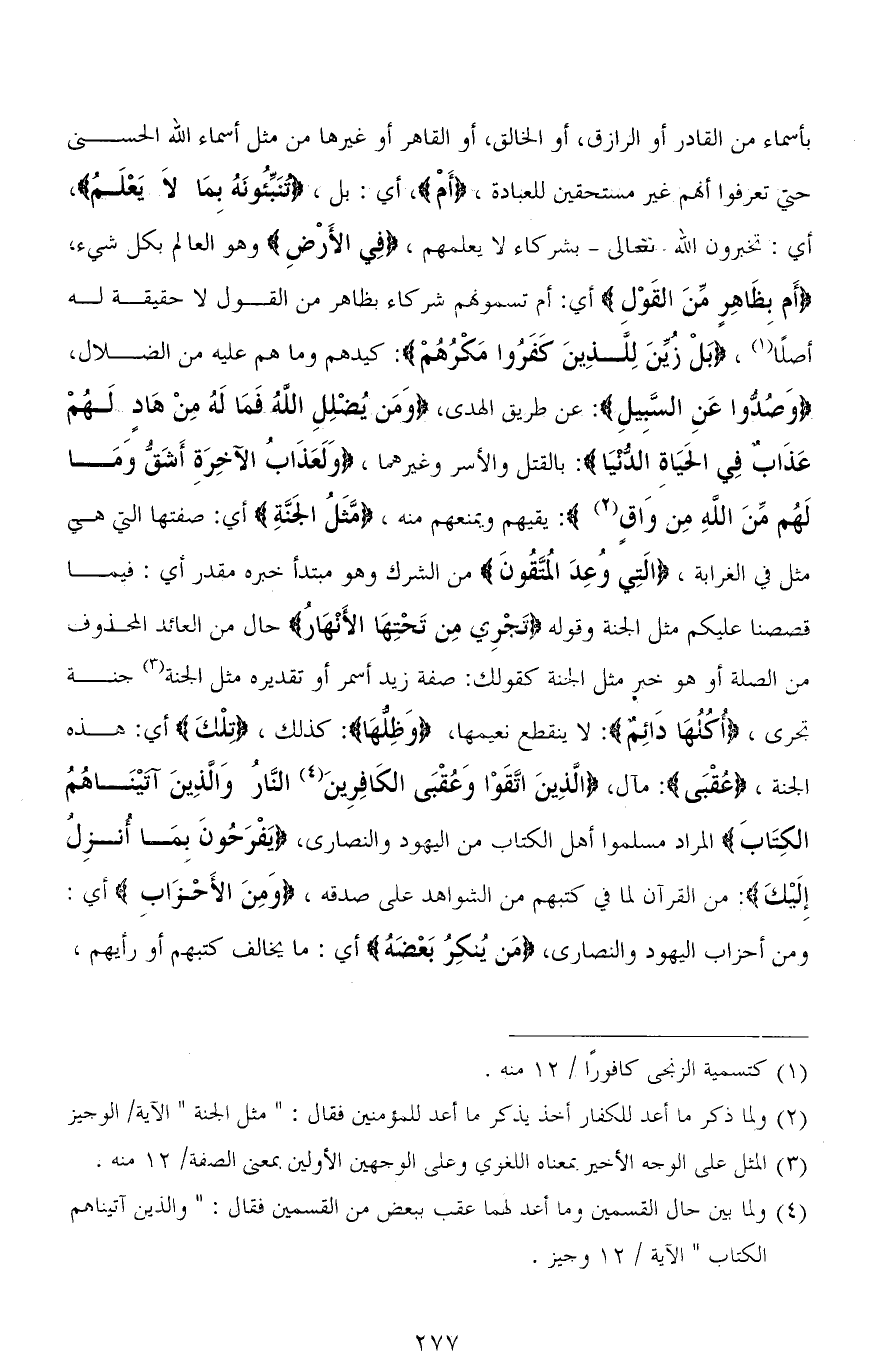 بأسماء من القادر أو الرازق، أو الخالق، أو القاهر أو غيرها من مثل أسماء الله الحسنى حتي تعرفوا أنهم غير مستحقين للعبادة، (أَمْ)، أي: بل، (تُنَبِّئُونَهُ بِمَا لَا يَعْلَمُ)، أي: تخبرون الله تعالى - بشركاء لا يعلمهم، (في الْأَرْضِ) وهو العالم بكل شىء، (أَمْ بِظَاهِرٍ مِنَ الْقَوْلِ) أي: أم تسمونهم شركاء بظاهر من القول لا حقيقة له أصلاً، (بَلْ زُيِّنَ لِلَّذِينَ كَفَرُوا مَكْرُهُمْ): كيدهم وما هم عليه من الضلال، (وَصُدُّوا عَنِ السَّبِيلِ): عن طريق الهدى، (وَمَنْ يُضْلِلِ اللهُ فَمَا لَهُ مِنْ هَادٍ (33) لَهُمْ عَذَابٌ فِي الْحَيَاةِ الدُّنْيَا): بالقتل والأسر وغيرهما، (وَلَعَذَابُ الْآخِرَةِ أَشَقُّ وَمَا لَهُمْ مِنَ اللهِ مِنْ وَاقٍ): يقيهم ويمنعهم منه، (مَثَلُ الجَنَّةِ) أي: صفتها التي هي مثل في الغرابة، (الَّتِي وُعِدَ الْمُتَّقُونَ) من الشركَ وهو مبتدأ خبره مقدر أي: فيما قصصنا عليكم مثل الجنة وقوله (تَجْرِي مِنْ تَحْتِهَا الْأَنْهَارُ) حال من العائد المحذوف من الصلة أو هو خبر مثل الجنة كقولك: صفة زيد أسمر أو تقديره مثل الجنة جنة تجرى، (أُكُلُهَا دَائِمٌ): لا ينقطع نعيمها، (وَظِلُّهَا): كذلك، (تِلْكَ) أي: هذه الجنة، (عُقْبَى): مآل، (الَّذِينَ اتَّقَوْا وَعُقْبَى الْكَافِرِينَ النَّارُ (35) وَالَّذِينَ آتَيْنَاهُمُ الْكِتَابَ) المراد مسلموا أهل الكتاب من اليهود والنصارى، (يَفْرَحُونَ بِمَا أُنْزِلَ إِلَيْكَ): من القرآن لما في كتبهم من الشواهد على صدقه، (وَمِنَ الأَحْزابِ) أي: ومن أحزاب اليهود والنصارى، (مَن يُنكِرُ بَعْضَهُ) أي: ما يخالف كتبهم أو رأيهم،
