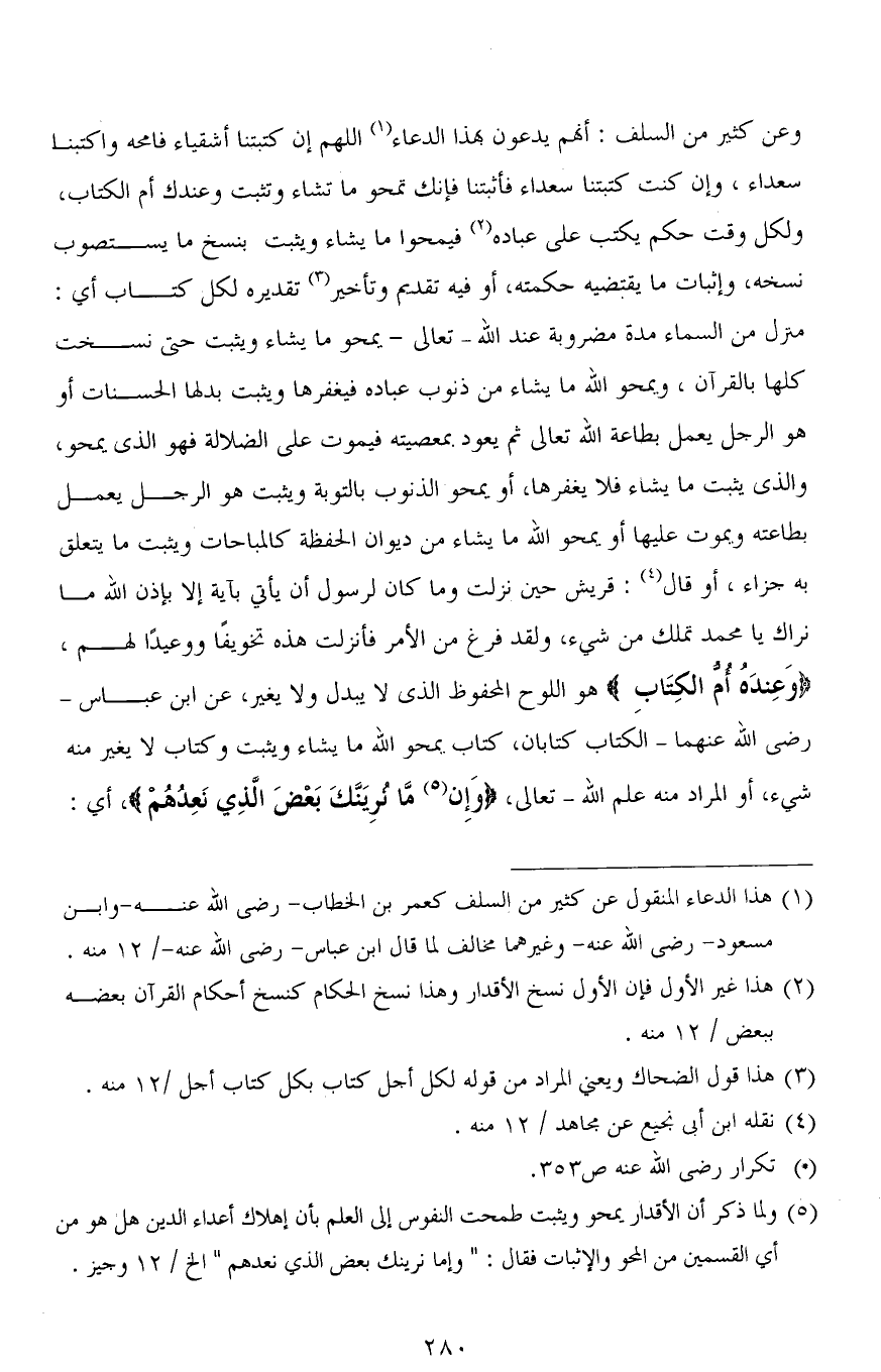 وعن كثير من السلف: أنهم يدعون بهذا الدعاء اللهم إن كتبتنا أشقياء فامحه واكتبنا سعداء، وإن كنت كتبتنا سعداء فاثبتنا فإنك تمحو ما تشاء وتثبت وعندك أم الكتاب، ولكل وقت حكم يكتب على عباده فيمحوا ما يشاء ويثبت بنسخ ما يستصوب نسخه، وإثبات ما يقتضيه حكمته، أو فيه تقديم وتأخير تقديره لكل كتاب أي: منزل من السماء مدة مضروبة عند الله - تعالى - يمحو ما يشاء ويثبت حتى نسخت كلها بالقرآن، ويمحو الله ما يشاء من ذنوب عباده فيغفرها ويثبت بدلها الحسنات أو هو الرجل يعمل بطاعة الله تعالى ثم يعود بمعصيته فيموت على الضلالة فهو الذي يمحو، والذي يثبت ما يشاء فلا يغفرها، أو يمحو الذنوب بالتوبة ويثبت هو الرجل يعمل بطاعته ويموت عليها أو يمحو الله ما يشاء من ديوان الحفظة كالمباحات ويثبت ما يتعلق به جزاء، أو قالت: قريش حين نزلت وما كان لرسول أن يأتي بآية إلا بإذن الله ما نراك يا محمد تملك من شيء، ولقد فرغ من الأمر فأنزلت هذه تخويفًا ووعيدًا لهم، (وَعِنْدَهُ أُمُّ الْكِتَابِ) هو اللوح المحفوظ الذي لا يبدل ولا يغير، عن ابن عباس - رضى الله عنهما - الكتاب كتابان، كتاب يمحو الله ما يشاء ويثبت وكتاب لا يغير منه شيء، أو المراد منه علم الله - تعالى، (وَإِنْ مَا نُرِيَنَّكَ بَعْضَ الَّذِي نَعِدُهُمْ)، أي: