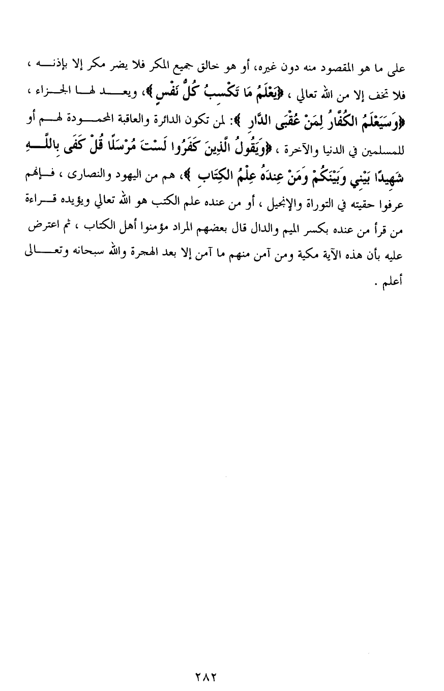على ما هو المقصود منه دون غيره، أو هو خالق جميع المكر فلا يضر مكر إلا بإذنه، فلا تخف إلا من الله تعالي، (يَعْلَمُ مَا تَكْسِبُ كُلُّ نَفْسٍ)، ويعد لها الجزاء، (وَسَيَعْلَمُ الْكُفَّارُ لِمَنْ عُقْبَى الدَّارِ): لمن تكون الدائرة والعاقبة المحمودة لهم أو للمسلمين في الدنيا والآخرة، (وَيَقُولُ الَّذِينَ كَفَرُوا لَسْتَ مُرْسَلًا قُلْ كَفَى بِاللهِ شَهِيدًا بَيْنِي وَبَيْنَكُمْ وَمَنْ عِنْدَهُ عِلْمُ الْكِتَابِ)، هم من اليهود والنصارى، فإنهم عرفوا حقيته في التوراة والإنجيل، أو من عنده علم الكتاب هو الله تعالي ويؤيده قراءة من قرأ (مِن عندِه) بكسر الميم والدال قال بعضهم المراد مؤمنوا أهل الْكِتَاب، ثم اعترض عليه بأن هذه الآية مكية ومن آمن منهم ما آمن إلا بعد الهجرة والله سبحانه وتعالى أعلم.
