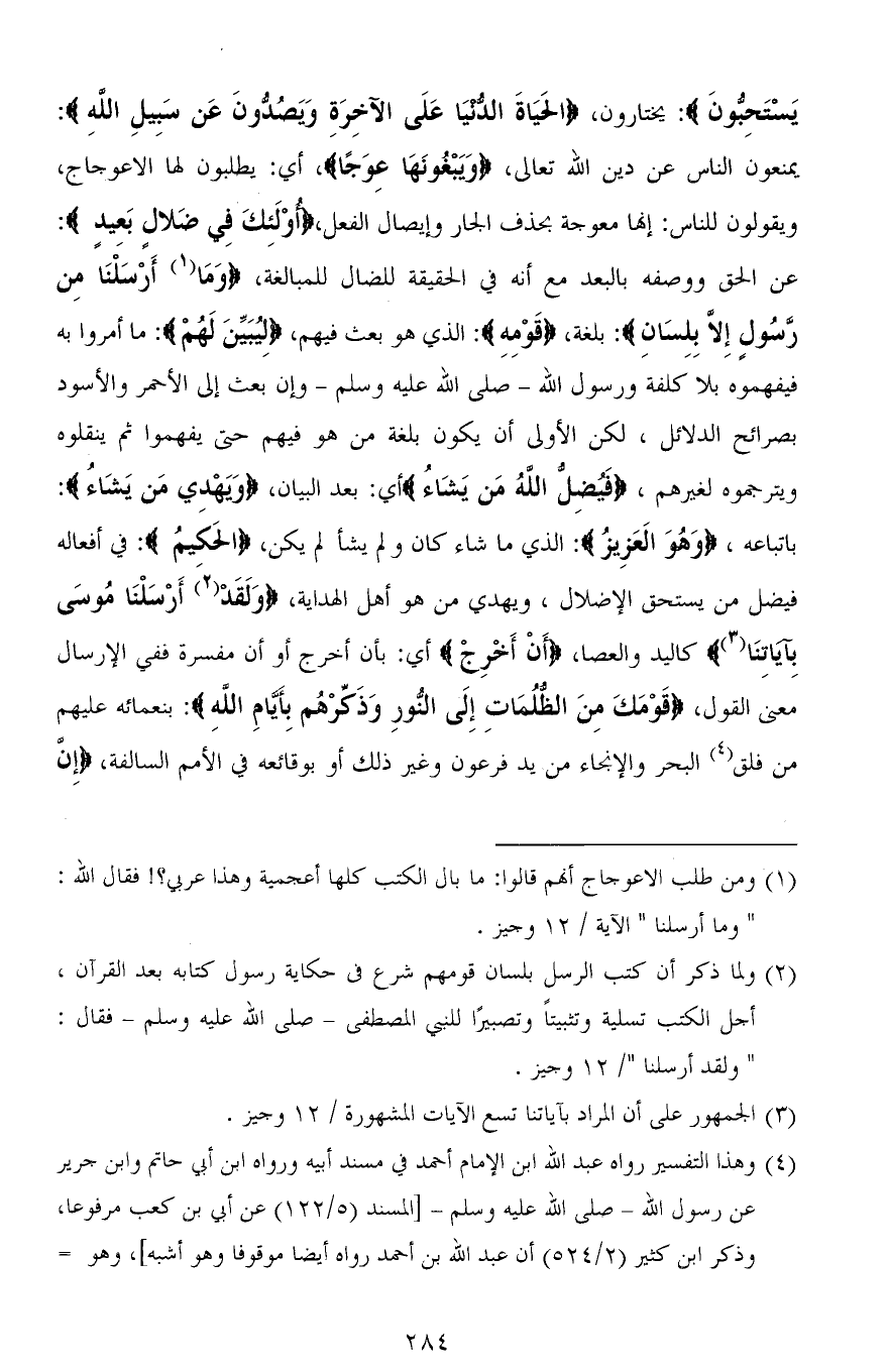 يَسْتَحِبُّونَ): يختارون، (الْحَيَاةَ الدُّنْيَا عَلَى الْآخِرَةِ وَيَصُدُّونَ عَنْ سَبِيلِ اللهِ): يمنعون الناس عن دين الله تعالى، (وَيَبْعونَهَا عِوَجًا)، أي: يطلبون لها الاعوجاج، ويقولون للناس: إنَّهَا معوجة بحذف الجار وإيصال الفعل، (أُوْلَئِكَ في ضَلالٍ بَعِيدٍ): عن الحق ووصفه بالبعد مع أنه في الحقيقة للضال للمبالغة، (وَمَا أَرْسَلْنَا مِن رَّسُولٍ إِلا بِلِسَانِ): بلغة، (قَومِهِ): الذي هو بعث فيهم، (لِيُبَيِّنَ لَهُمْ): ما أمروا به فيفهموه بلا كلفة ورسول الله - صلى الله عليه وسلم - وإن بعث إلى الأحمر والأسود بصرائح الدلائل، لكن الأولى أن يكون بلغة مَن هو فيهم حتى يفهموا ثم ينقلوه ويترجموه لغيرهم، (فيضِل الله من يَشَاء) أي: بعد البيان، (وَيَهْدِي مَن يَشَاءُ): باتباعه، (وَهُوَ الَعَزِيزُ): الذي ما شاء كان وما لم يشأ لم يكن، (الحَكِيمُ): في أفعاله فيضل من يستحق الإضلال، ويهدى من هو أهل الهداية، (وَلَقَدْ أَرْسَلْنَا مُوسَى بِآيَاتِنَا) كاليد والعصا، (أَنْ أَخْرِجْ) أي: بأن أخرج أو أن مفسرة ففي الإرسال معنى القول، (قَوْمَكَ مِنَ الظُّلُمَاتِ إِلَى النُّورِ وَذَكِّرْهُمْ بِأَيَّامِ اللهِ): بنعمائه عليهم من فلق البحر والإنجاء من يد فرعون وغير ذلك أو بوقائعه في الأمم السالفة، (إِنَّ