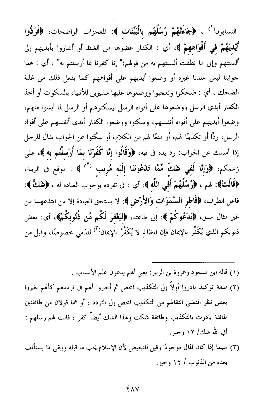 النسَّابون، (جَاءَتْهُمْ رُسُلُهُمْ بِالْبَيِّنَاتِ): المعجزات الواضحات، (فَرَدُّوا أَيْدِيَهُمْ فِي أَفْوَاهِهِمْ)، أي: الكفار عضوها من الغيظ أو أشاروا بأيديهم إلى ألسنتهم وإلى ما نطقت ألسنتهم به من قولهم: (إنا كفرنا بما أرسلتم به)، أي: هذا جوابنا ليس عندنا غيره أو وضعوا أيديهم على أفواههم كما يفعل ذلك من غلبة الضحك، أي: ضحكوا وتعجبوا ووضعوها عليها مشيرين للأنبياء بالسكوت أو أخذ الكفار أيدي الرسل ووضعوها على أفواه الرسل ليسكتوهم أو الرسل لما أيسوا منهم، وضعوا أيديهم على أفواه أنفسهم، وسكتوا ووضعوا الكفار أيدي أنفسهم على أفواه الرسل، ردًّا أو تكذيبًا لهم، أو منعًا لهم من الكلام، أو سكتوا عن الجواب يقال للرجل إذا أمسك عن الجواب: رد يده في فيه، (وَقَالُوا إِنَّا كَفَرْنَا بِمَا أُرْسِلْتُمْ بِهِ)، على زعمكم، (وَإِنَّا لَفِي شَكٍّ مِمَّا تَدْعُونَنَا إِلَيْهِ مُرِيبٍ): موقع في الريبة، (قَالَتْ): لهم، (رُسُلُهُمْ أَفِي اللهِ)، أي: في تفرده بوجوب العبادة له، (شَكٌّ): فاعل الظرف، (فاطِرِ السَّمَاوَاتِ وَالأَرْضِ): لا يستحق العبادة إلا من ابتدعهما من غير مثال سبق، (يدْعُوكُمْ): إلى طاعته، (لِيَغْفِرَ لَكُمْ مِنْ ذُنُوبِكُمْ)، أي: بعض ذنوبكم الذي يُكَفَّر بالإيمان فإن المظالم لا يُكَفَّرُ بالإيمان للذمي خصوصًا، وقيل من