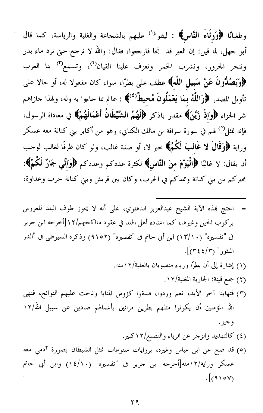 وطغيانًا (وَرِئَاءَ النَّاسِ): ليثنوا عليهم بالشجاعة والغلبة والرياسة، كما قال أبو جهل، لما قيل: إن العير قد نجا فارجعوا، فقال: والله لا نرجع حتى نرد ماء بدر وننحر الجزور، ونشرب الخمر وتعزف علينا القيان، وتسمع بنا العرب (وَيَصُدُّونَ عَنْ سَبِيلِ اللهِ) عطف على بطرًا، سواء كان مفعولاً، أو حالاً على تأويل المصدر (وَاللهُ بِمَا يَعْمَلُونَ مُحِيطٌ): عالم بما جاءوا به وله، ولهذا جازاهم شر الجزاء (وَإِذْ زَيَّنَ) مقدر باذكر (لَهُمُ الشَّيْطَانُ أَعْمَالَهُمْ) في معاداة الرسول، فإنه تمثل لهم في سورة سراقة بن مالك الكناني، وهو من أكابر بني كنانة معه عسكر وراية (وَقَالَ لا غَالبَ لَكُمُ) خبر لا، أو صفة غالب، ولو كان ظرفًا لغالب لوجب أن يقال: لا غالبًا (اليوْمَ مِنَ النَّاسِ) لكثرة عددكم وعددكم (وَإِنِّي جَارٌ لَكُمْ):