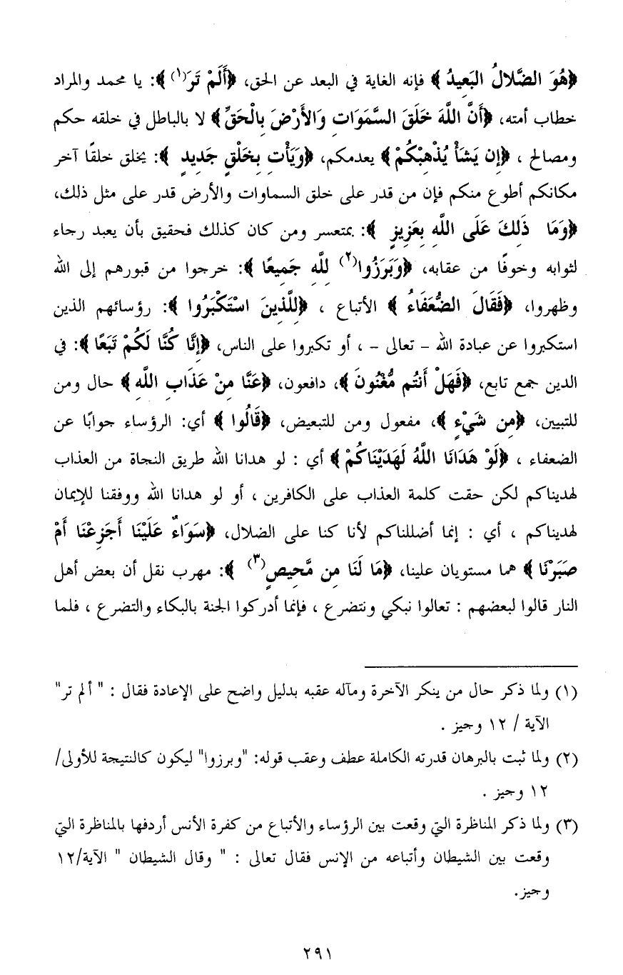 (هُوَ الضَّلَالُ الْبَعِيدُ) فإنه الغاية في البعد عن الحق، (أَلَمْ تَرَ): يا محمد والمراد خطاب أمته، (أَنْ الله خَلَقَ السَّمَاوَاتِ وَالأَرْضَ بِالْحَقِّ) لا بالباطل في خلقه حكم ومصالح، (إِن يَشَأْ يُذْهِبْكُمْ) يعدمكم، (وَيَأْتِ بِخَلْقٍ جَدِيدٍ): يخلق خلقًا آخر مكانكم أطوع منكم فإن من قدر على خلق السماوات والأرض قدر على مثل ذلك، (وَمَا ذَلِكَ عَلَى اللهِ بِعَزِيزٍ): بمتعسر ومن كان كذلك فحقيق بأن يعبد رجاء لثوابه وخوفًا من عقابه، (وَبَرَزُوا لله جَمِيعًا): خرجوا من قبورهم إلى الله وظهروا، (فَقَالَ الضُّعَفَاءُ) الأتباع، (لِلَّذِينَ اسْتَكْبَرُوا): رؤسائهم الذين استكبروا عن عبادة الله - تعالى -، أو تكبروا على الناس، (إِنَّا كُنَّا لَكُمْ تَبَعًا): في الدين جمع تابع، (فَهَلْ أَنْتُمْ مُغْنُونَ)، دافعون، (عَنَّا مِنْ عَذَابِ اللهِ) حال ومن للتبيين، (مِنْ شَيْءٍ)، مفعول ومن للتبعيض، (قَالُوا) أي: الرؤساء جوابًا عن الضعفاء، (لَوْ هَدَانَا اللهُ لَهَدَيْنَاكُمْ) أي: لو هدانا الله طريق النجاة من العذاب لهديناكم لكن حقت كلمة العذاب على الكافرين، أو لو هدانا الله ووفقنا للإيمان لهديناكم، أي: إنما أضللناكم لأنا كنا على الضلال، (سَوَاءٌ عَلَيْنَا أَجَزِعْنَا أَمْ صَبَرْنَا) هما مستويان علينا، (مَا لَنَا مِنْ مَحِيصٍ): مهرب نقل أن بعض أهل النار قالوا لبعضهم: تعالوا نبكي ونتضرع، فإنما أدركوا الجنة بالبكاء والتضرع، فلما