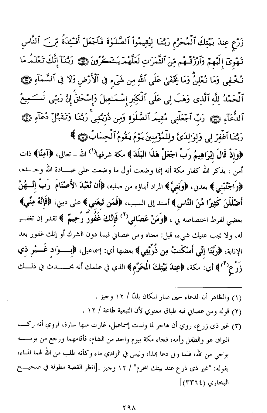 زَرْعٍ عِنْدَ بَيْتِكَ الْمُحَرَّمِ رَبَّنَا لِيُقِيمُوا الصَّلَاةَ فَاجْعَلْ أَفْئِدَةً مِنَ النَّاسِ تَهْوِي إِلَيْهِمْ وَارْزُقْهُمْ مِنَ الثَّمَرَاتِ لَعَلَّهُمْ يَشْكُرُونَ (37) رَبَّنَا إِنَّكَ تَعْلَمُ مَا نُخْفِي وَمَا نُعْلِنُ وَمَا يَخْفَى عَلَى اللهِ مِنْ شَيْءٍ فِي الْأَرْضِ وَلَا فِي السَّمَاءِ (38) الْحَمْدُ لله الَّذِي وَهَبَ لِي عَلَى الْكِبَرِ إِسْمَاعِيلَ وَإِسْحَاقَ إِنَّ رَبِّي لَسَمِيعُ الدُّعَاءِ (39) رَبِّ اجْعَلْنِي مُقِيمَ الصَّلَاةِ وَمِنْ ذُرِّيَّتِي رَبَّنَا وَتَقَبَّلْ دُعَاءِ (40) رَبَّنَا اغْفِرْ لِي وَلِوَالِدَيَّ وَلِلْمُؤْمِنِينَ يَوْمَ يَقُومُ الْحِسَابُ (41)