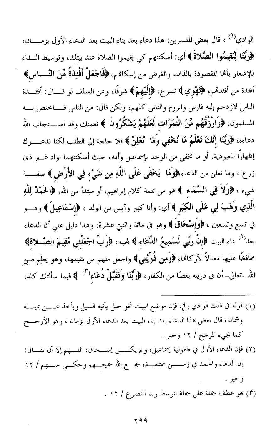 الوادي، قال بعض المفسرين: هذا دعاء بعد بناء البيت بعد الدعاء الأول بزمان، (رَبَّنَا لِيُقِيمُوا الصَّلَاةَ) أي: أسكنتهم كي يقيموا الصلاة عند بيتك، وتوسيط النداء للإشعار بأنها المقصودة بالذات والغرض من إسكانهم، (فَاجْعَلْ أَفْئِدَةً مِنَ النَّاسِ) أفئدة من أفئدتهم، (تَهْوِي) تسرع، (إِلَيْهِمْ) شوقًا، وعن السلف لو قال: أفئدة الناس لازدحم إليه فارس والروم والناس كلهم، ولكن قال: من الناس فاختص به المسلمون، (وَارْزُقْهُمْ مِنَ الثَّمَرَاتِ لَعَلَّهُمْ يَشْكُرُونَ) نعمتك وقد استجاب الله دعاءه، (رَبَّنَا إِنَّكَ تَعْلَمُ مَا نُخْفِي وَمَا نُعْلِنُ) فلا حاجة إلى الطلب لكنا ندعوك إظهارًا للعبودية، أو ما نخفي من الوجد بإسماعيل وأمه، حيث أسكنتهما بواد غير ذي زرع، وما نعلن من الدعاء (وَمَا يَخْفَى عَلَى اللهِ مِنْ شَيْءٍ فِي الْأَرْضِ) صفة شيء، (وَلَا فِي السَّمَاءِ) هو من تتمة كلام إبراهيم، أو مبتدأ من الله، (الحَمْدُ للهِ الَّذِي وَهَبَ لِي عَلَى الكِبَرِ) أي: وأنا كبير وآيس من الولد، (إِسْمَاعِيلَ) وهو في تسع وتسعين، (وَإِسْحَاقَ) وهو في مائة واثنتي عشرة، وهذا دليل علي أن الدعاء بعد بناء البيت (إِنَّ ربي لَسَمِيعُ الدُّعَاءِ) لمجيبه، (رَبِّ اجْعَلْنِي مُقِيمَ الصَّلاةِ) محافظًا عليها معدلاً لأركانها، (وَمِنْ ذُرِّيَّتِي) واجعل منهم من يقيمها، وهو يعلم من الله - تعالى - أن في ذريته بعضًا من الكفار، (رَبَّنَا وَتَقَبَّلْ دُعَاءِ) فيما سألتك كله،