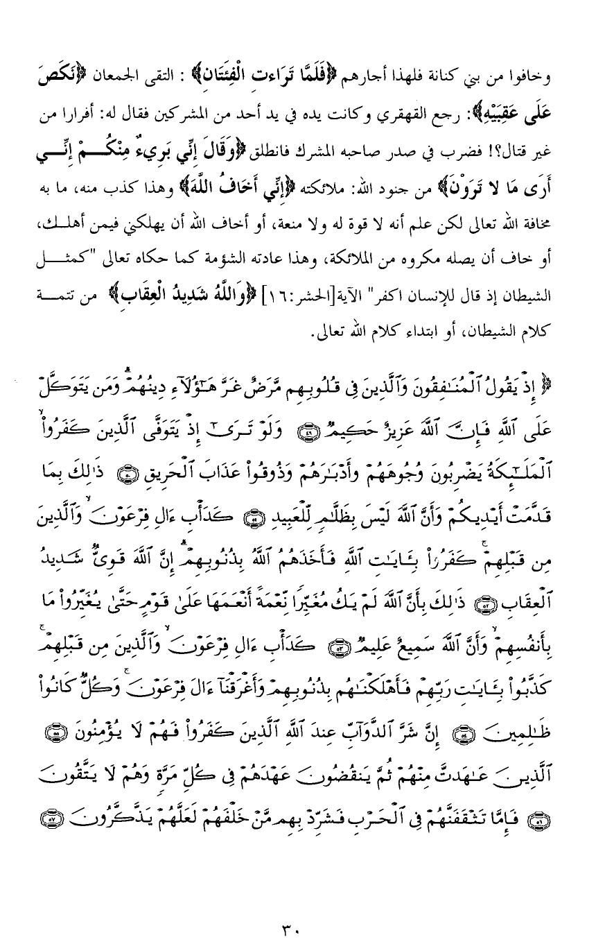 (إِذْ يَقُولُ الْمُنَافِقُونَ وَالَّذِينَ فِي قُلُوبِهِمْ مَرَضٌ غَرَّ هَؤُلَاءِ دِينُهُمْ وَمَنْ يَتَوَكَّلْ عَلَى اللهِ فَإِنَّ اللهَ عَزِيزٌ حَكِيمٌ (49) وَلَوْ تَرَى إِذْ يَتَوَفَّى الَّذِينَ كَفَرُوا الْمَلَائِكَةُ يَضْرِبُونَ وُجُوهَهُمْ وَأَدْبَارَهُمْ وَذُوقُوا عَذَابَ الْحَرِيقِ (50) ذَلِكَ بِمَا قَدَّمَتْ أَيْدِيكُمْ وَأَنَّ اللهَ لَيْسَ بِظَلَّامٍ لِلْعَبِيدِ (51) كَدَأْبِ آلِ فِرْعَوْنَ وَالَّذِينَ مِنْ قَبْلِهِمْ كَفَرُوا بِآيَاتِ اللهِ فَأَخَذَهُمُ اللهُ بِذُنُوبِهِمْ إِنَّ اللهَ قَوِيٌّ شَدِيدُ الْعِقَابِ (52) ذَلِكَ بِأَنَّ اللهَ لَمْ يَكُ مُغَيِّرًا نِعْمَةً أَنْعَمَهَا عَلَى قَوْمٍ حَتَّى يُغَيِّرُوا مَا بِأَنْفُسِهِمْ وَأَنَّ اللهَ سَمِيعٌ عَلِيمٌ (53) كَدَأْبِ آلِ فِرْعَوْنَ وَالَّذِينَ مِنْ قَبْلِهِمْ كَذَّبُوا بِآيَاتِ رَبِّهِمْ فَأَهْلَكْنَاهُمْ بِذُنُوبِهِمْ وَأَغْرَقْنَا آلَ فِرْعَوْنَ وَكُلٌّ كَانُوا ظَالِمِينَ (54) إِنَّ شَرَّ الدَّوَابِّ عِنْدَ اللهِ الَّذِينَ كَفَرُوا فَهُمْ لَا يُؤْمِنُونَ (55) الَّذِينَ عَاهَدْتَ مِنْهُمْ ثُمَّ يَنْقُضُونَ عَهْدَهُمْ فِي كُلِّ مَرَّةٍ وَهُمْ لَا يَتَّقُونَ (56) فَإِمَّا تَثْقَفَنَّهُمْ فِي الْحَرْبِ فَشَرِّدْ بِهِمْ مَنْ خَلْفَهُمْ لَعَلَّهُمْ يَذَّكَّرُونَ (57)