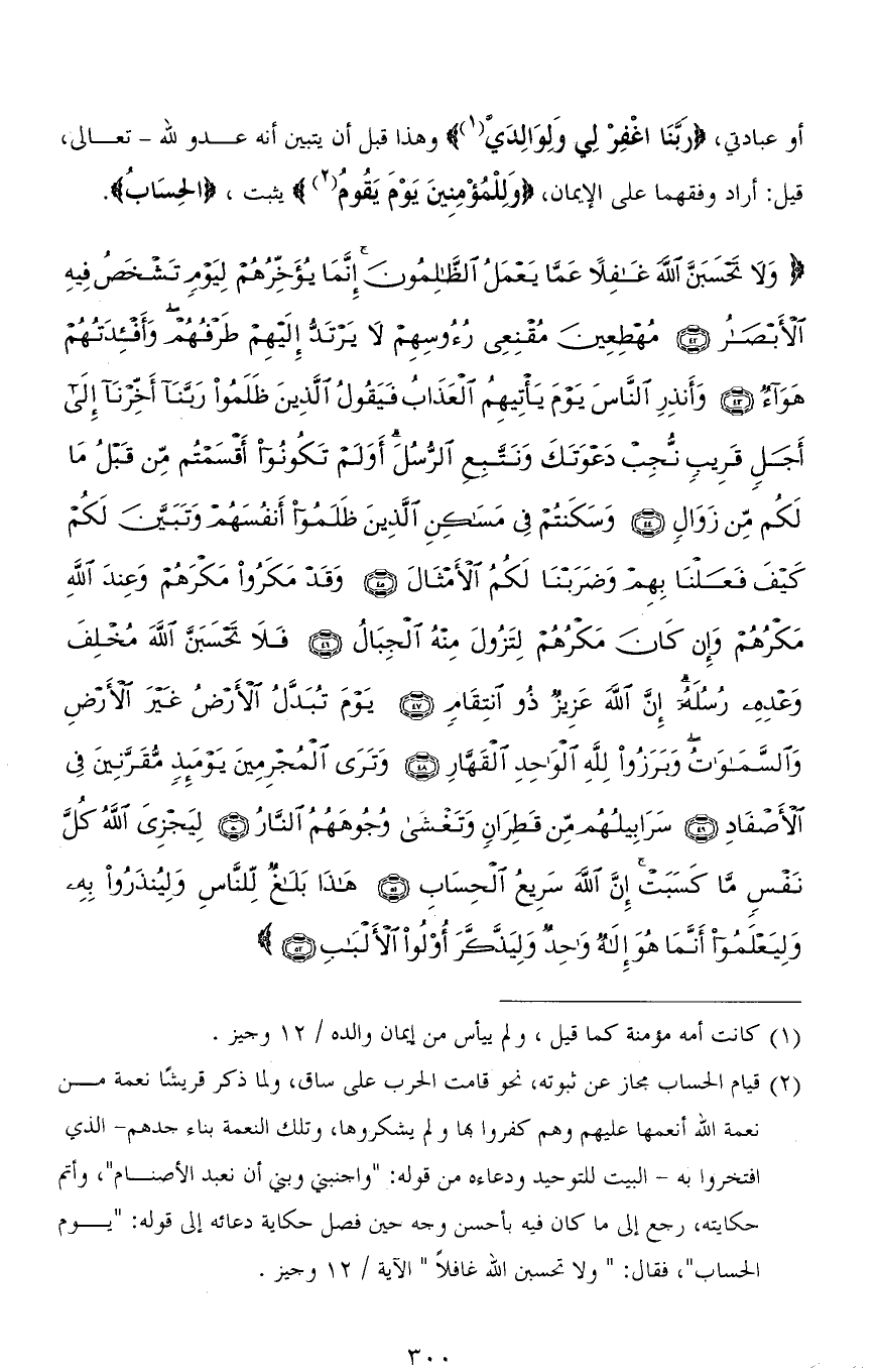 (وَلَا تَحْسَبَنَّ اللهَ غَافِلًا عَمَّا يَعْمَلُ الظَّالِمُونَ إِنَّمَا يُؤَخِّرُهُمْ لِيَوْمٍ تَشْخَصُ فِيهِ الْأَبْصَارُ (42) مُهْطِعِينَ مُقْنِعِي رُءُوسِهِمْ لَا يَرْتَدُّ إِلَيْهِمْ طَرْفُهُمْ وَأَفْئِدَتُهُمْ هَوَاءٌ (43) وَأَنْذِرِ النَّاسَ يَوْمَ يَأْتِيهِمُ الْعَذَابُ فَيَقُولُ الَّذِينَ ظَلَمُوا رَبَّنَا أَخِّرْنَا إِلَى أَجَلٍ قَرِيبٍ نُجِبْ دَعْوَتَكَ وَنَتَّبِعِ الرُّسُلَ أَوَلَمْ تَكُونُوا أَقْسَمْتُمْ مِنْ قَبْلُ مَا لَكُمْ مِنْ زَوَالٍ (44) وَسَكَنْتُمْ فِي مَسَاكِنِ الَّذِينَ ظَلَمُوا أَنْفُسَهُمْ وَتَبَيَّنَ لَكُمْ كَيْفَ فَعَلْنَا بِهِمْ وَضَرَبْنَا لَكُمُ الْأَمْثَالَ (45) وَقَدْ مَكَرُوا مَكْرَهُمْ وَعِنْدَ اللهِ مَكْرُهُمْ وَإِنْ كَانَ مَكْرُهُمْ لِتَزُولَ مِنْهُ الْجِبَالُ (46) فَلَا تَحْسَبَنَّ اللهَ مُخْلِفَ وَعْدِهِ رُسُلَهُ إِنَّ اللهَ عَزِيزٌ ذُو انْتِقَامٍ (47) يَوْمَ تُبَدَّلُ الْأَرْضُ غَيْرَ الْأَرْضِ وَالسَّمَاوَاتُ وَبَرَزُوا لله الْوَاحِدِ الْقَهَّارِ (48) وَتَرَى الْمُجْرِمِينَ يَوْمَئِذٍ مُقَرَّنِينَ فِي الْأَصْفَادِ (49) سَرَابِيلُهُمْ مِنْ قَطِرَانٍ وَتَغْشَى وُجُوهَهُمُ النَّارُ (50) لِيَجْزِيَ اللهُ كُلَّ نَفْسٍ مَا كَسَبَتْ إِنَّ اللهَ سَرِيعُ الْحِسَابِ (51) هَذَا بَلَاغٌ لِلنَّاسِ وَلِيُنْذَرُوا بِهِ وَلِيَعْلَمُوا أَنَّمَا هُوَ إِلَهٌ وَاحِدٌ وَلِيَذَّكَّرَ أُولُو الْأَلْبَابِ (52)