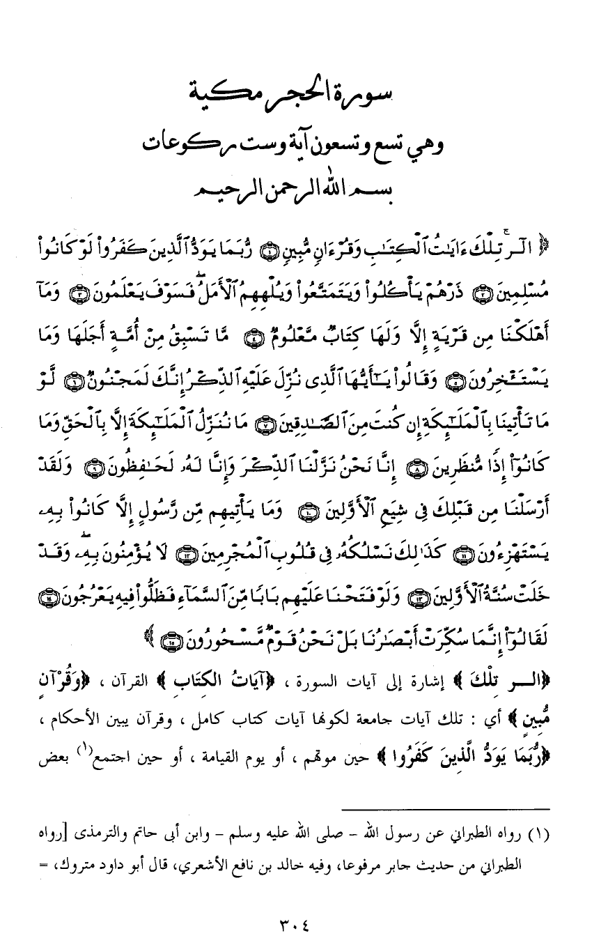 الر تِلْكَ آيَاتُ الْكِتَابِ وَقُرْآنٍ مُبِينٍ (1) رُبَمَا يَوَدُّ الَّذِينَ كَفَرُوا لَوْ كَانُوا مُسْلِمِينَ (2) ذَرْهُمْ يَأْكُلُوا وَيَتَمَتَّعُوا وَيُلْهِهِمُ الْأَمَلُ فَسَوْفَ يَعْلَمُونَ (3) وَمَا أَهْلَكْنَا مِنْ قَرْيَةٍ إِلَّا وَلَهَا كِتَابٌ مَعْلُومٌ (4) مَا تَسْبِقُ مِنْ أُمَّةٍ أَجَلَهَا وَمَا يَسْتَأْخِرُونَ (5) وَقَالُوا يَا أَيُّهَا الَّذِي نُزِّلَ عَلَيْهِ الذِّكْرُ إِنَّكَ لَمَجْنُونٌ (6) لَوْ مَا تَأْتِينَا بِالْمَلَائِكَةِ إِنْ كُنْتَ مِنَ الصَّادِقِينَ (7) مَا نُنَزِّلُ الْمَلَائِكَةَ إِلَّا بِالْحَقِّ وَمَا كَانُوا إِذًا مُنْظَرِينَ (8) إِنَّا نَحْنُ نَزَّلْنَا الذِّكْرَ وَإِنَّا لَهُ لَحَافِظُونَ (9) وَلَقَدْ أَرْسَلْنَا مِنْ قَبْلِكَ فِي شِيَعِ الْأَوَّلِينَ (10) وَمَا يَأْتِيهِمْ مِنْ رَسُولٍ إِلَّا كَانُوا بِهِ يَسْتَهْزِءُونَ (11) كَذَلِكَ نَسْلُكُهُ فِي قُلُوبِ الْمُجْرِمِينَ (12) لَا يُؤْمِنُونَ بِهِ وَقَدْ خَلَتْ سُنَّةُ الْأَوَّلِينَ (13) وَلَوْ فَتَحْنَا عَلَيْهِمْ بَابًا مِنَ السَّمَاءِ فَظَلُّوا فِيهِ يَعْرُجُونَ (14) لَقَالُوا إِنَّمَا سُكِّرَتْ أَبْصَارُنَا بَلْ نَحْنُ قَوْمٌ مَسْحُورُونَ (15)