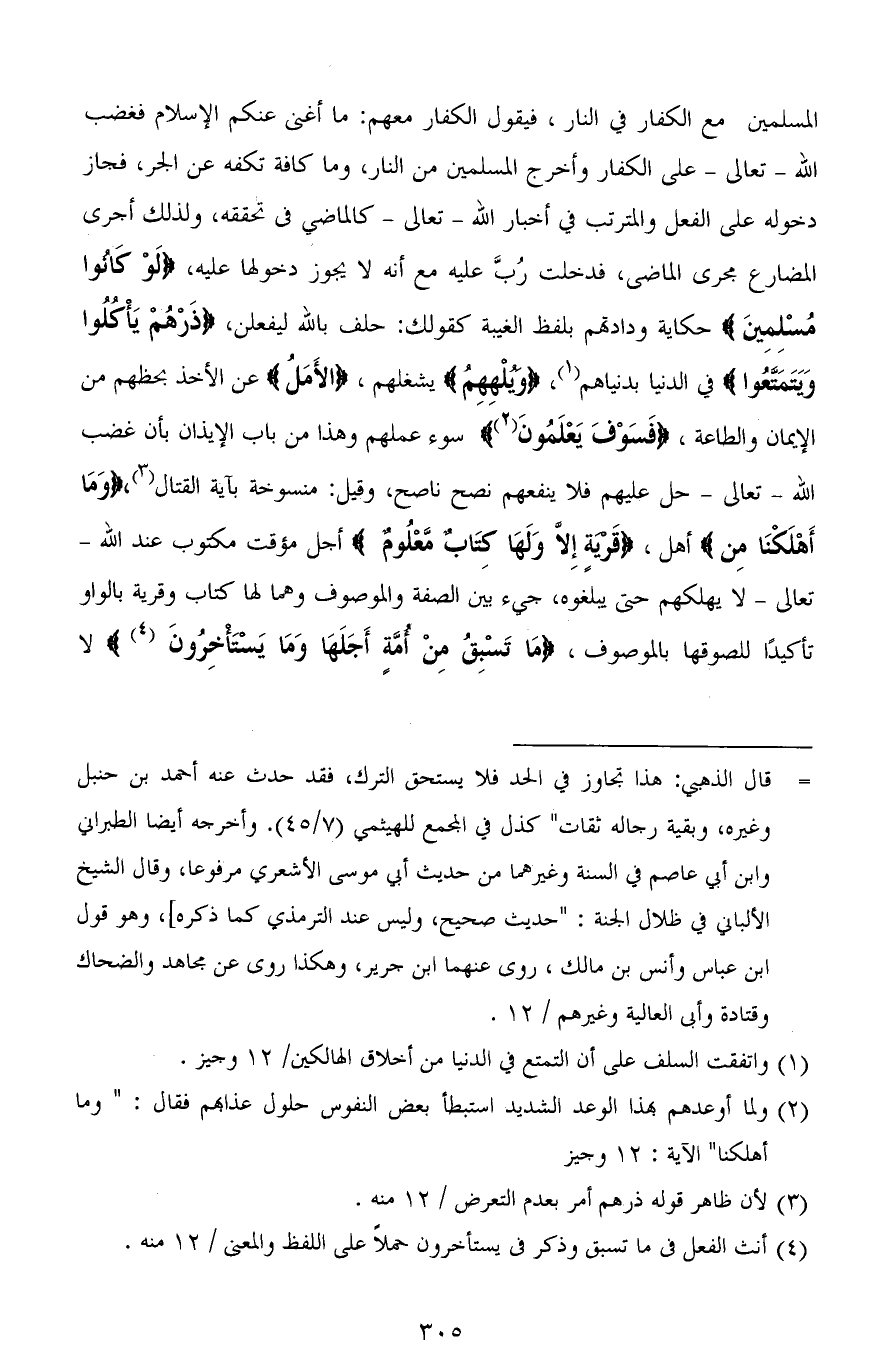 المسلمين مع الكفار في النار، فيقول الكفار معهم: ما أغني عنكم الإسلام فغضب الله - تعالى - على الكفار وأخرج المسلمين من النار، وما كافة تكفه عن الجر، فجاز دخوله على الفعل والمترتب في أخبار الله - تعالى - كالماضي في تحققه، ولذلك أجرى المضارع مجرى الماضي، فدخلت رُبَّ عليه مع أنه لا يجوز دخولها عليه، (لَوْ كَانُوا مسْلِمِينَ) حكاية ودادتهم بلفظ الغيبة كقولك: حلف بالله ليفعلن، (ذَرْهُمْ يَأْكُلُوا وَيَتَمَتَّعُوا) في الدنيا بدنياهم، (وَيُلْهِهِمُ) يشغلهم، (الْأَمَلُ) عن الأخذ بحظهم من الإيمان والطاعة، (فَسَوْفَ يَعْلَمُونَ) سوء عملهم وهذا من باب الإيذان بأن غضب الله - تعالى - حلَّ عليهم فلا ينفعهم نصح ناصح، وقيل: منسوخة بآية القتال، (وَمَا أَهْلَكْنَا مِنْ) أهل، (قَرْيَةٍ إِلَّا وَلَهَا كِتَابٌ مَعْلُومٌ) أجل مؤقت مكتوب عند الله - تعالى - لا يهلكهم حتى يبلغوه، جيء بين الصفة والموصوف وهما لها كتاب وقرية بالواو تأكيدًا للصوقها بالموصوف، (مَا تَسْبِقُ مِنْ أُمَّةٍ أَجَلَهَا وَمَا يَسْتَأْخِرُونَ)