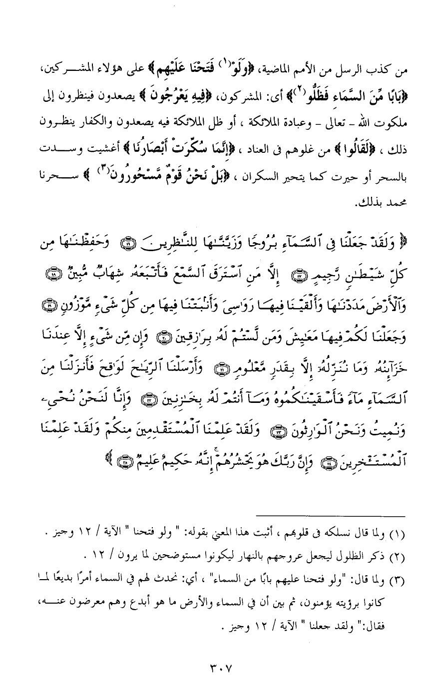 (وَلَقَدْ جَعَلْنَا فِي السَّمَاءِ بُرُوجًا وَزَيَّنَّاهَا لِلنَّاظِرِينَ (16) وَحَفِظْنَاهَا مِنْ كُلِّ شَيْطَانٍ رَجِيمٍ (17) إِلَّا مَنِ اسْتَرَقَ السَّمْعَ فَأَتْبَعَهُ شِهَابٌ مُبِينٌ (18) وَالْأَرْضَ مَدَدْنَاهَا وَأَلْقَيْنَا فِيهَا رَوَاسِيَ وَأَنْبَتْنَا فِيهَا مِنْ كُلِّ شَيْءٍ مَوْزُونٍ (19) وَجَعَلْنَا لَكُمْ فِيهَا مَعَايِشَ وَمَنْ لَسْتُمْ لَهُ بِرَازِقِينَ (20) وَإِنْ مِنْ شَيْءٍ إِلَّا عِنْدَنَا خَزَائِنُهُ وَمَا نُنَزِّلُهُ إِلَّا بِقَدَرٍ مَعْلُومٍ (21) وَأَرْسَلْنَا الرِّيَاحَ لَوَاقِحَ فَأَنْزَلْنَا مِنَ السَّمَاءِ مَاءً فَأَسْقَيْنَاكُمُوهُ وَمَا أَنْتُمْ لَهُ بِخَازِنِينَ (22) وَإِنَّا لَنَحْنُ نُحْيِي وَنُمِيتُ وَنَحْنُ الْوَارِثُونَ (23) وَلَقَدْ عَلِمْنَا الْمُسْتَقْدِمِينَ مِنْكُمْ وَلَقَدْ عَلِمْنَا الْمُسْتَأْخِرِينَ (24) وَإِنَّ رَبَّكَ هُوَ يَحْشُرُهُمْ إِنَّهُ حَكِيمٌ عَلِيمٌ (25)